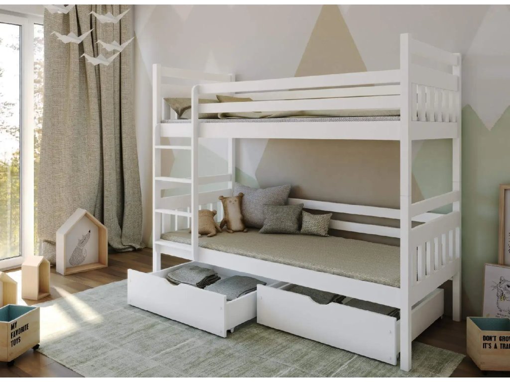 Jemná a jednoduchá esence světelného designu. Model Adaś je celý vyroben z borovicového dřeva. Dětem od 6 let se doporučuje používat horní patro. Postel určená pro děti, které snadno šplhají po žebříku. Má zaoblené hrany, což klade důraz na bezpečnost dětí. Celé horní patro je zajištěno zábradlím. Ve spodní části postele chybí jedna z bočnic. Bez ohledu na velikost postele, kterou si vyberete, si můžete vybrat správnou matraci. Model je dostupný v několika barevných provedeních.Doplňkové parametry