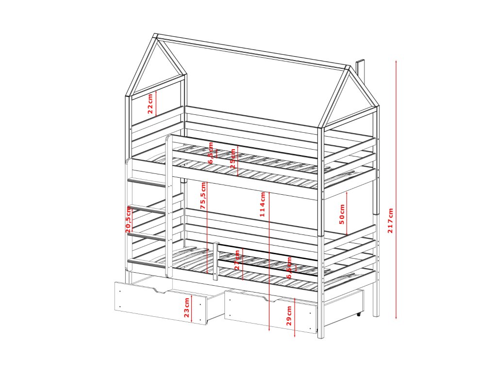 Patrová postel ALEX je jedním z těch návrhů, které skvěle poslouží při zařizování atmosférického prostoru. Konstrukce svým vzhledem připomíná domeček, takže se rychle stane oblíbeným místem pro hraní vašich dětí. Přes noc budou nejmenší chráněni zábranami umístěnými kolem nábytku. S domácí postelí ALEX si můžete být jisti, že celá vaše rodina bude mít relaxační spánek bez stresu. Ceníme si přírodního přístupu, a proto byl model vyroben z pravého borovicového dřeva. Jeho povrch je pokryt 3 vrstvami ekologického laku, který je pro vaše dítě zcela bezpečný. Objevte postel ALEX house v různých barvách a vyberte si odstín, který dokonale ladí se stylem, ve kterém chcete zařídit pokoj svého dítěte!Doplňkové parametry