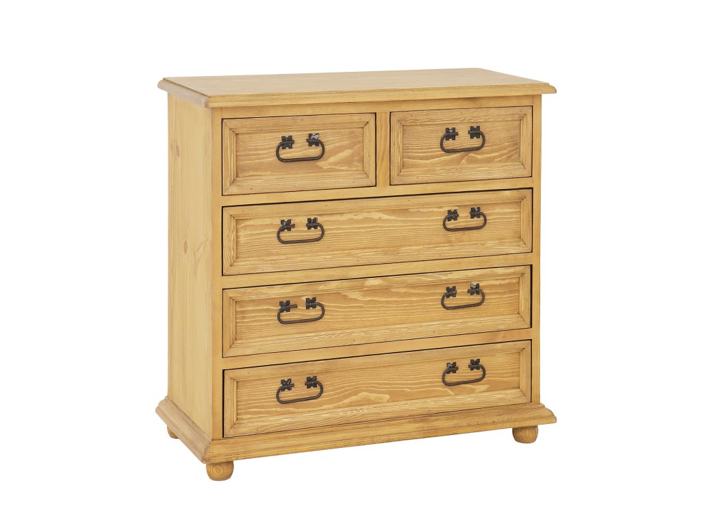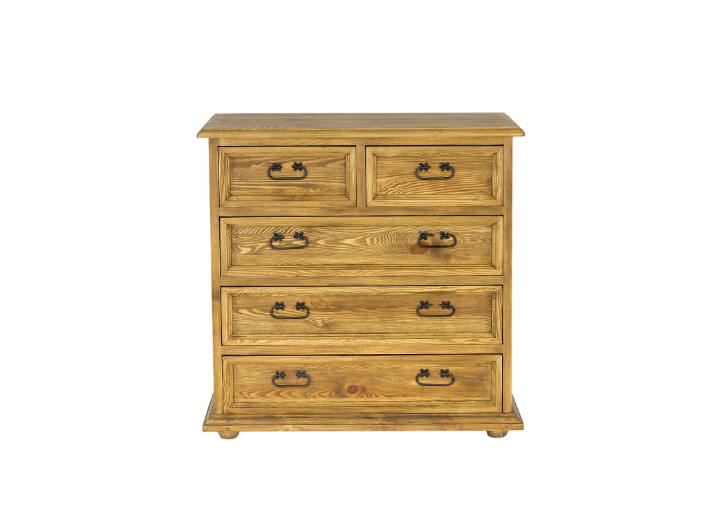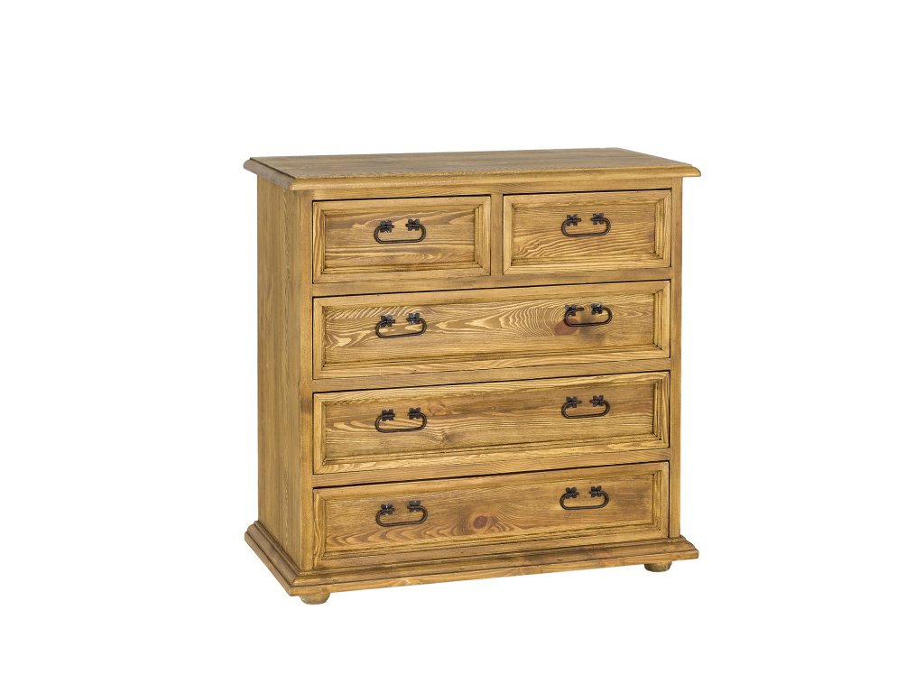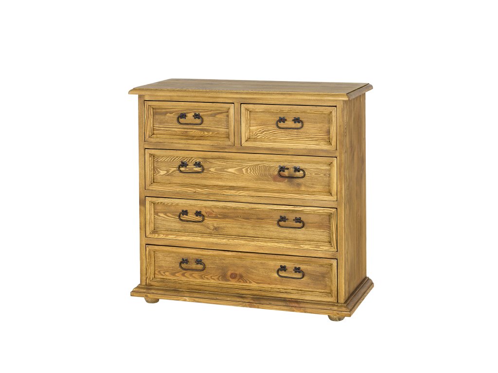 Voskovaná komoda KD702 ve verzi SLIM, navržená v rustikálním stylu, celá z masivního borovicového dřeva. Má dvě menší zásuvky umístěné v horní části nábytku a tři větší, posuvné na dřevěných vodítkách. K výrobě byly použity ručně vyrobené kovové úchyty a panty s letitým efektem. Komoda má odolnou a pevnou konstrukci. Ideální do ložnic a šaten. Dodá každému interiéru jedinečnou atmosféru, plnou tepla a rodinné atmosféry. Díky jeho funkčnosti bude skladování mnohem jednodušší. STANDARDNÍ verze komody KD802 Komoda KD702 je pokryta přírodním včelím voskem, který vytváří vrstvu, která chrání před vlhkostí a zároveň pečuje o dřevo. Díky voskování zvýrazníme přirozenou strukturu dřeva a prohloubíme jeho přirozenou barvu. Včelí vosk je přírodní produkt, voskovaný nábytek tak získává antistatické vlastnosti – méně se na jeho povrchu usazuje prach. Další výhodou voskovaného nábytku je jeho hedvábně hladký povrch a příjemná vůně přírodního dřeva. Udržení zdravé struktury dřeva je základem dlouhé životnosti voskovaného nábytku. V záložce "Údržba a používání voskovaného nábytku" najdete cenné rady k pravidlům péče o nábytek z kolekce Rustikal.