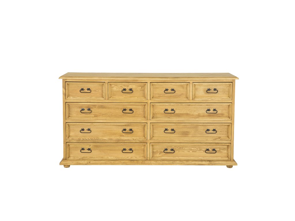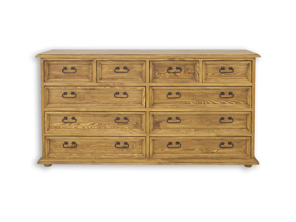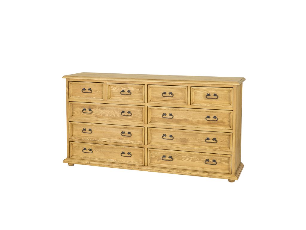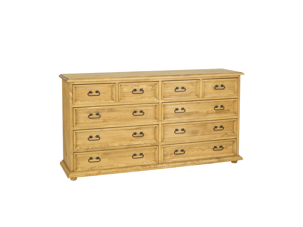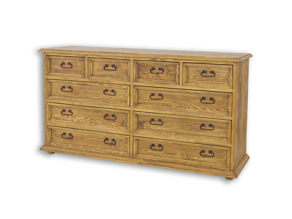 Voskovaná komoda KD708 ve verzi SLIM, navržená v rustikálním stylu, celá vyrobena z masivního borovicového dřeva. Skládá se z řady čtyř malých zásuvek umístěných v horní části nábytku a šesti větších, posuvných na dřevěných vodítkách. K výrobě byly použity ručně vyrobené kovové úchyty a panty s letitým efektem. Komoda má odolnou a pevnou konstrukci. Ideální do ložnic a šaten. Dodá každému interiéru jedinečnou atmosféru, plnou tepla a rodinné atmosféry. Díky jeho funkčnosti bude skladování mnohem jednodušší. STANDARDNÍ verze komody KD808 Komoda KD708 je pokryta přírodním včelím voskem, který vytváří vrstvu, která chrání před vlhkostí a zároveň pečuje o dřevo. Díky voskování zvýrazníme přirozenou strukturu dřeva a prohloubíme jeho přirozenou barvu. Včelí vosk je přírodní produkt, voskovaný nábytek tak získává antistatické vlastnosti – méně se na jeho povrchu usazuje prach. Další výhodou voskovaného nábytku je jeho hedvábně hladký povrch a příjemná vůně přírodního dřeva. Udržení zdravé struktury dřeva je základem dlouhé životnosti voskovaného nábytku. V záložce "Údržba a používání voskovaného nábytku" najdete cenné rady k pravidlům péče o nábytek z kolekce Rustikal.