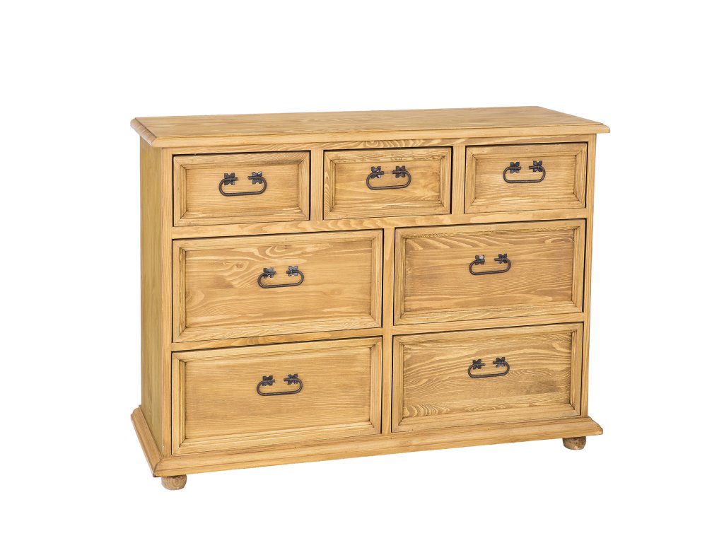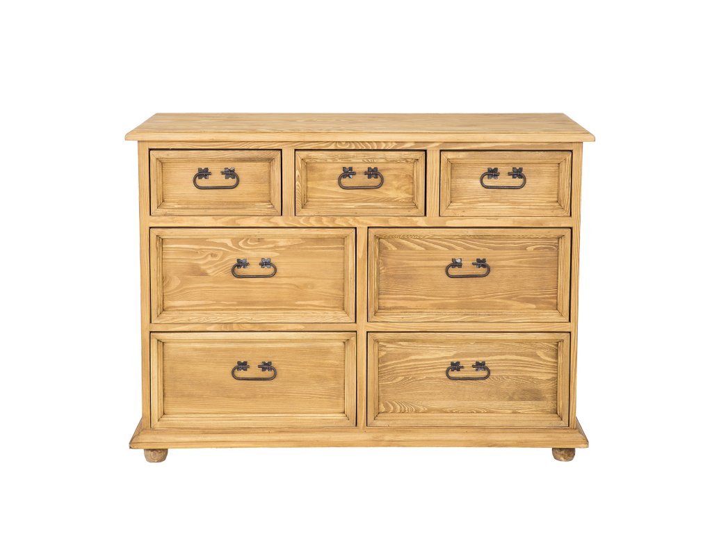 Voskovaná komoda ve verzi SLIM KD710 navržená v rustikálním stylu, celá z masivního borovicového dřeva. Má čtyři hluboké zásuvky a tři malé zásuvky přímo pod pracovní deskou, všechny se vysouvají na dřevěných vodítkách. K výrobě byly použity ručně vyrobené kovové úchyty a panty s letitým efektem. Komoda má odolnou a pevnou konstrukci. Ideální do obývacího pokoje, ložnice nebo šatny. Dodá každému interiéru jedinečnou atmosféru, plnou tepla a rodinné atmosféry. Díky jeho funkčnosti bude skladování mnohem jednodušší. STANDARDNÍ verze komody KD810 Borová komoda KD710 je pokryta přírodním včelím voskem, který vytváří vrstvu, která chrání před vlhkostí a zároveň pečuje o dřevo. Díky voskování zvýrazníme přirozenou strukturu dřeva a prohloubíme jeho přirozenou barvu. Včelí vosk je přírodní produkt, voskovaný nábytek tak získává antistatické vlastnosti – méně se na jeho povrchu usazuje prach. Další výhodou voskovaného nábytku je jeho hedvábně hladký povrch a příjemná vůně přírodního dřeva. Udržení zdravé struktury dřeva je základem dlouhé životnosti voskovaného nábytku. V záložce "Údržba a používání voskovaného nábytku" najdete cenné rady k pravidlům péče o nábytek z kolekce Rustikal.