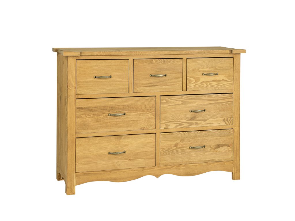 Voskovaná komoda KD716 navržená v rustikálním stylu, celá vyrobena z masivního borovicového dřeva. Má tři zásuvky přímo pod pracovní deskou a čtyři větší a prostorné zásuvky pod. Ideální do obývacího pokoje, ložnice nebo šatny jako věšák na prádlo. Dodá každému interiéru jedinečnou atmosféru, plnou tepla a rodinné atmosféry. Díky jeho funkčnosti bude skladování mnohem jednodušší. Komoda má odolnou a pevnou konstrukci. Minimalistická, jednoduchá a elegantní komoda. Borová komoda KD716 je pokryta přírodním včelím voskem, který vytváří vrstvu, která chrání před vlhkostí a zároveň dřevo vyživuje. Díky voskování zvýrazníme přirozenou strukturu dřeva a prohloubíme jeho přirozenou barvu. Včelí vosk je přírodní produkt, voskovaný nábytek tak získává antistatické vlastnosti – méně se na jeho povrchu usazuje prach. Další výhodou voskovaného nábytku je jeho hedvábně hladký povrch a příjemná vůně přírodního dřeva. Udržení zdravé struktury dřeva je základem dlouhé životnosti voskovaného nábytku. V záložce "Údržba a používání voskovaného nábytku" najdete cenné rady k pravidlům péče o nábytek z kolekce Rustikal.