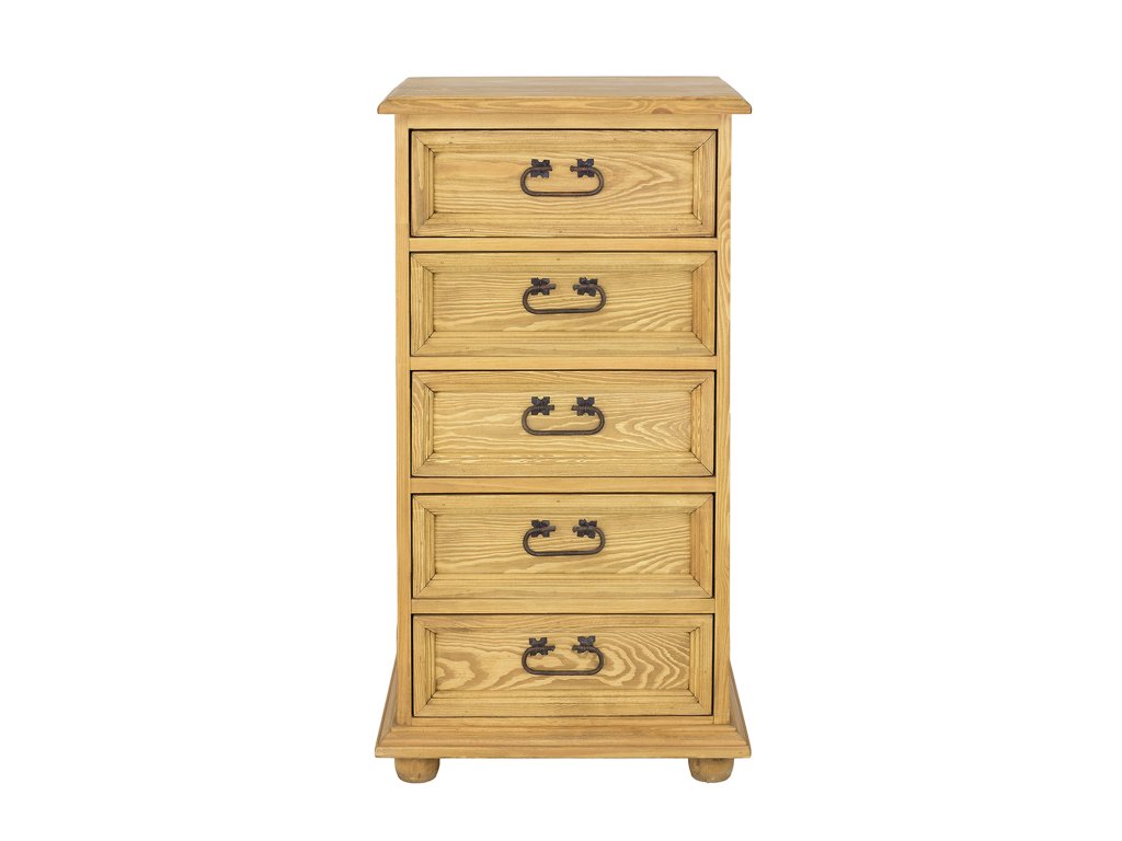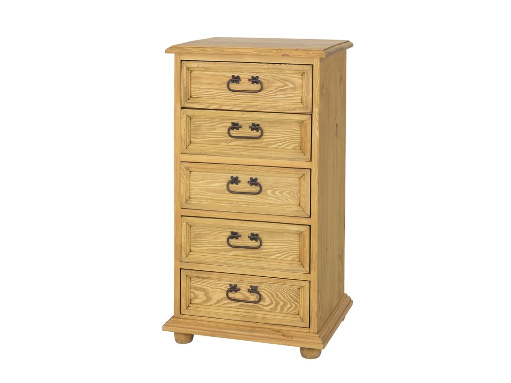 Voskovaná komoda KD717 ve verzi SLIM, navržená v rustikálním stylu, celá z masivního borovicového dřeva. Skládá se z řady pěti zásuvek, posuvných na dřevěných vodítkách. K výrobě byly použity ručně vyrobené kovové úchyty a panty s letitým efektem. Komoda má odolnou a pevnou konstrukci. Ideální do ložnic a šaten. Dodá každému interiéru jedinečnou atmosféru, plnou tepla a rodinné atmosféry. Díky jeho funkčnosti bude skladování mnohem jednodušší. Verze komody STANDARD KD817 Komoda KD717 je pokryta přírodním včelím voskem, který vytváří vrstvu, která chrání před vlhkostí a zároveň pečuje o dřevo. Díky voskování zvýrazníme přirozenou strukturu dřeva a prohloubíme jeho přirozenou barvu. Včelí vosk je přírodní produkt, voskovaný nábytek tak získává antistatické vlastnosti – méně se na jeho povrchu usazuje prach. Další výhodou voskovaného nábytku je jeho hedvábně hladký povrch a příjemná vůně přírodního dřeva. Udržení zdravé struktury dřeva je základem dlouhé životnosti voskovaného nábytku. V záložce "Údržba a používání voskovaného nábytku" najdete cenné rady k pravidlům péče o nábytek z kolekce Rustikal.
