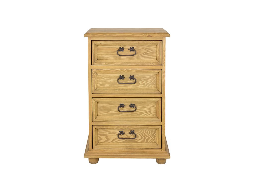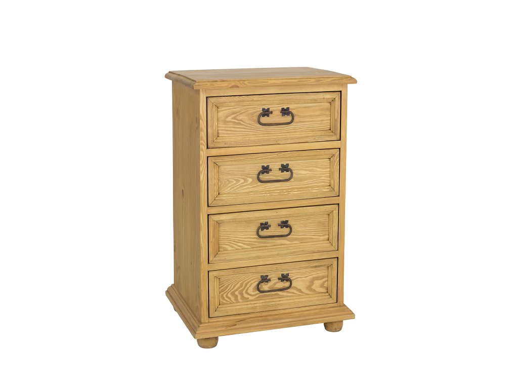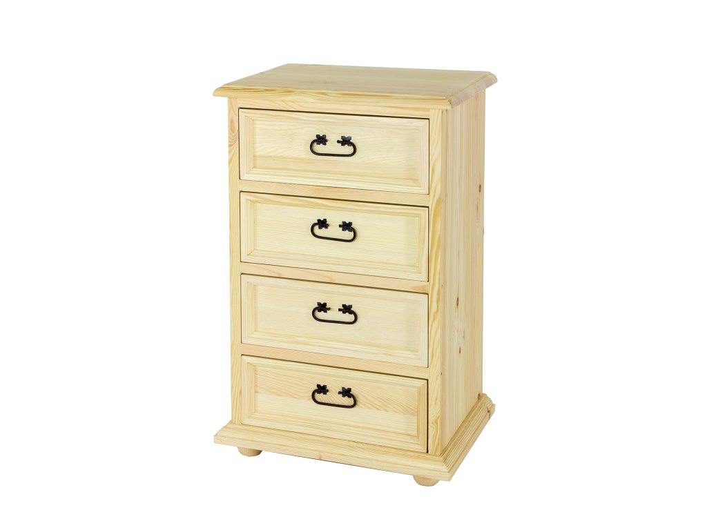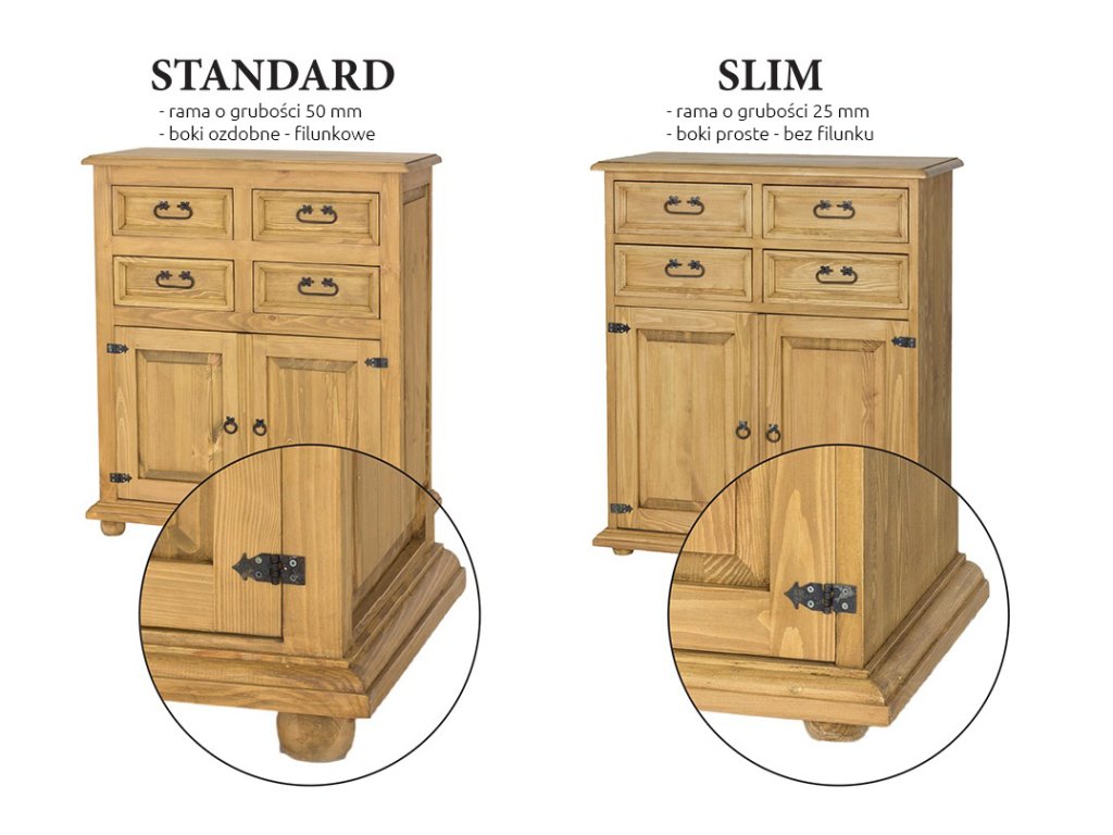 Voskovaná komoda KD800 ve verzi STANDARD, navržená v rustikálním stylu, celá vyrobena z masivního borovicového dřeva. Skládá se z řady čtyř zásuvek, posuvných na dřevěných vodítkách. K výrobě byly použity ručně vyrobené kovové úchyty a panty s letitým efektem. Komoda má odolnou a pevnou konstrukci. Ideální do ložnic a šaten. Dodá každému interiéru jedinečnou atmosféru, plnou tepla a rodinné atmosféry. Díky jeho funkčnosti bude skladování mnohem jednodušší. Štíhlá komoda KD700 Komoda KD800 je pokryta přírodním včelím voskem, který vytváří vrstvu, která chrání před vlhkostí a zároveň pečuje o dřevo. Díky voskování zvýrazníme přirozenou strukturu dřeva a prohloubíme jeho přirozenou barvu. Včelí vosk je přírodní produkt, voskovaný nábytek tak získává antistatické vlastnosti – méně se na jeho povrchu usazuje prach. Další výhodou voskovaného nábytku je jeho hedvábně hladký povrch a příjemná vůně přírodního dřeva. Udržení zdravé struktury dřeva je základem dlouhé životnosti voskovaného nábytku. V záložce "Údržba a používání voskovaného nábytku" najdete cenné rady k pravidlům péče o nábytek z kolekce Rustikal.