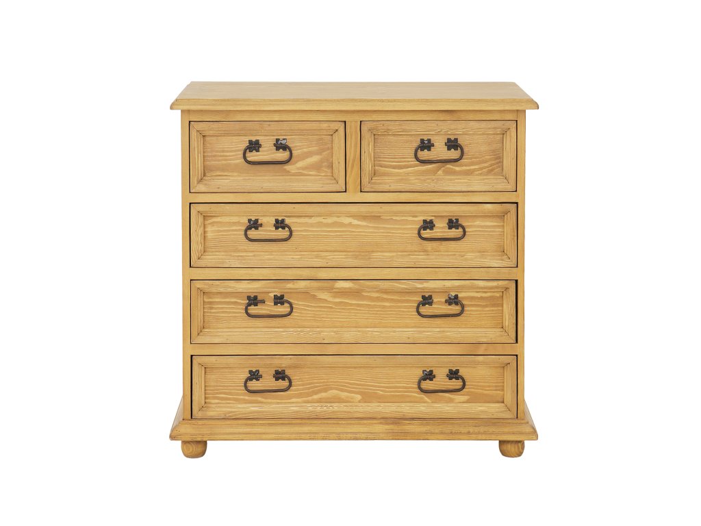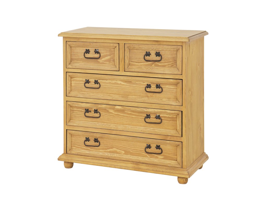 Voskovaná komoda KD802 ve verzi STANDARD, navržená v rustikálním stylu, celá z masivního borovicového dřeva. Má dvě menší zásuvky umístěné v horní části nábytku a tři větší, posuvné na dřevěných vodítkách. K výrobě byly použity ručně vyrobené kovové úchyty a panty s letitým efektem. Komoda má odolnou a pevnou konstrukci. Ideální do ložnic a šaten. Dodá každému interiéru jedinečnou atmosféru, plnou tepla a rodinné atmosféry. Díky jeho funkčnosti bude skladování mnohem jednodušší. Komoda ve verzi SLIM KD702 Komoda KD802 je pokryta přírodním včelím voskem, který vytváří vrstvu, která chrání před vlhkostí a zároveň pečuje o dřevo. Díky voskování zvýrazníme přirozenou strukturu dřeva a prohloubíme jeho přirozenou barvu. Včelí vosk je přírodní produkt, voskovaný nábytek tak získává antistatické vlastnosti – méně se na jeho povrchu usazuje prach. Další výhodou voskovaného nábytku je jeho hedvábně hladký povrch a příjemná vůně přírodního dřeva. Udržení zdravé struktury dřeva je základem dlouhé životnosti voskovaného nábytku. V záložce "Údržba a používání voskovaného nábytku" najdete cenné rady k pravidlům péče o nábytek z kolekce Rustikal.