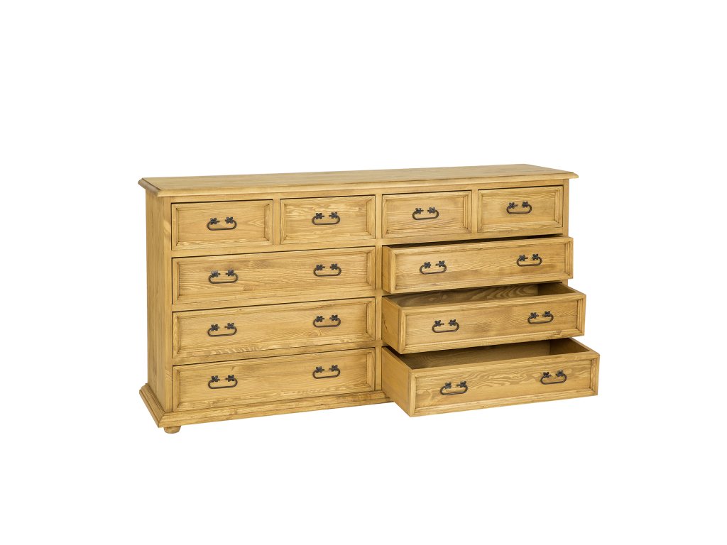 Voskovaná komoda KD808 ve verzi STANDARD navržená v rustikálním stylu, celá z masivního borovicového dřeva. Skládá se z řady čtyř malých zásuvek umístěných v horní části nábytku a šesti větších, posuvných na dřevěných vodítkách. K výrobě byly použity ručně vyrobené kovové úchyty a panty s letitým efektem. Komoda má odolnou a pevnou konstrukci. Ideální do ložnic a šaten. Dodá každému interiéru jedinečnou atmosféru, plnou tepla a rodinné atmosféry. Díky jeho funkčnosti bude skladování mnohem jednodušší. Komoda ve verzi SLIM KD708 Komoda KD808 je pokryta přírodním včelím voskem, který vytváří vrstvu, která chrání před vlhkostí a zároveň pečuje o dřevo. Díky voskování zvýrazníme přirozenou strukturu dřeva a prohloubíme jeho přirozenou barvu. Včelí vosk je přírodní produkt, voskovaný nábytek tak získává antistatické vlastnosti – méně se na jeho povrchu usazuje prach. Další výhodou voskovaného nábytku je jeho hedvábně hladký povrch a příjemná vůně přírodního dřeva. Udržení zdravé struktury dřeva je základem dlouhé životnosti voskovaného nábytku. V záložce "Údržba a používání voskovaného nábytku" najdete cenné rady k pravidlům péče o nábytek z kolekce Rustikál.