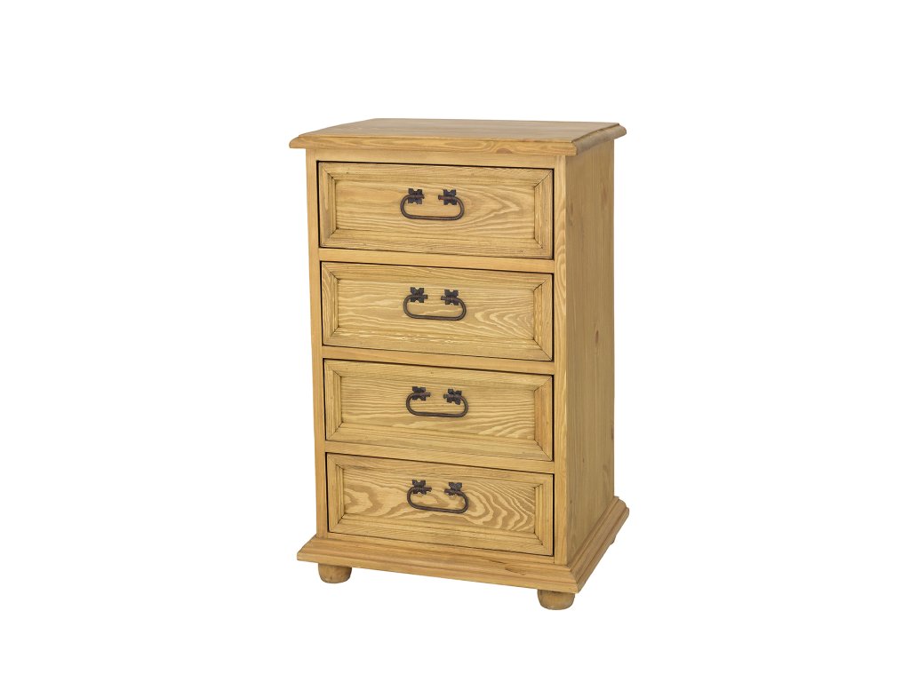 Voskovaná komoda KD700 ve verzi SLIM, navržená v rustikálním stylu, celá z masivního borovicového dřeva. Skládá se z řady čtyř zásuvek, posuvných na dřevěných vodítkách. K výrobě byly použity ručně vyrobené kovové úchyty a panty s letitým efektem. Komoda má odolnou a pevnou konstrukci. Ideální do ložnic a šaten. Dodá každému interiéru jedinečnou atmosféru, plnou tepla a rodinné atmosféry. Díky jeho funkčnosti bude skladování mnohem jednodušší. Standardní verze komody KD800 Komoda KD700 je pokryta přírodním včelím voskem, který vytváří vrstvu, která chrání před vlhkostí a zároveň pečuje o dřevo. Díky voskování zvýrazníme přirozenou strukturu dřeva a prohloubíme jeho přirozenou barvu. Včelí vosk je přírodní produkt, voskovaný nábytek tak získává antistatické vlastnosti – méně se na jeho povrchu usazuje prach. Další výhodou voskovaného nábytku je jeho hedvábně hladký povrch a příjemná vůně přírodního dřeva. Udržení zdravé struktury dřeva je základem dlouhé životnosti voskovaného nábytku. V záložce "Údržba a používání voskovaného nábytku" najdete cenné rady k pravidlům péče o nábytek z kolekce Rustikal.