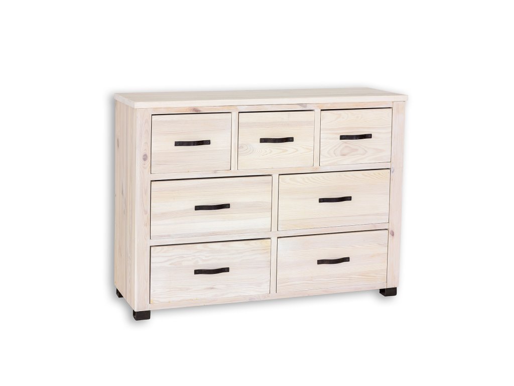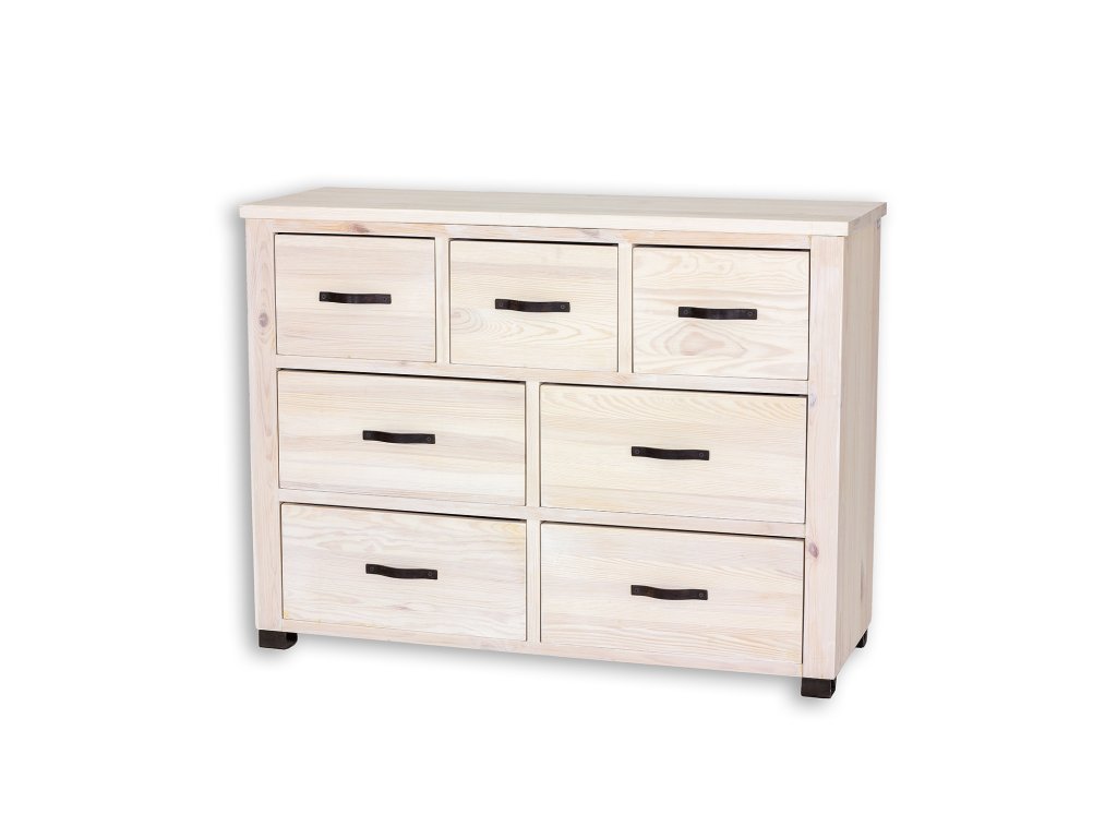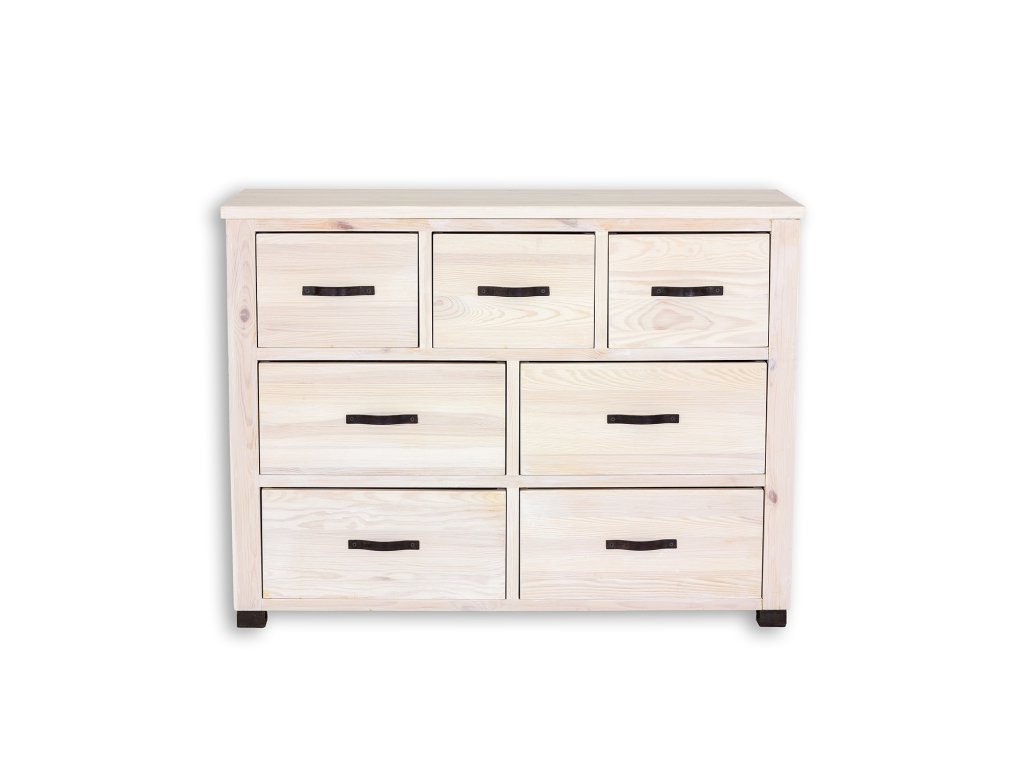 Voskovaná komoda KD721 navržená v rustikálním stylu, celá vyrobena z masivního borovicového dřeva. Má tři zásuvky přímo pod pracovní deskou a čtyři větší a prostorné zásuvky pod. Ideální do obývacího pokoje, ložnice nebo šatny jako věšák na prádlo. Dodá každému interiéru jedinečnou atmosféru, plnou tepla a rodinné atmosféry. Díky jeho funkčnosti bude skladování mnohem jednodušší. Komoda má odolnou a pevnou konstrukci. Minimalistická, jednoduchá a elegantní komoda. Borová komoda KD721 je pokryta přírodním včelím voskem, který vytváří vrstvu, která chrání před vlhkostí a zároveň dřevo vyživuje. Díky voskování zvýrazníme přirozenou strukturu dřeva a prohloubíme jeho přirozenou barvu. Včelí vosk je přírodní produkt, voskovaný nábytek tak získává antistatické vlastnosti – méně se na jeho povrchu usazuje prach. Další výhodou voskovaného nábytku je jeho hedvábně hladký povrch a příjemná vůně přírodního dřeva. Udržení zdravé struktury dřeva je základem dlouhé životnosti voskovaného nábytku. V záložce "Údržba a používání voskovaného nábytku" najdete cenné rady k pravidlům péče o nábytek z kolekce Rustikal.