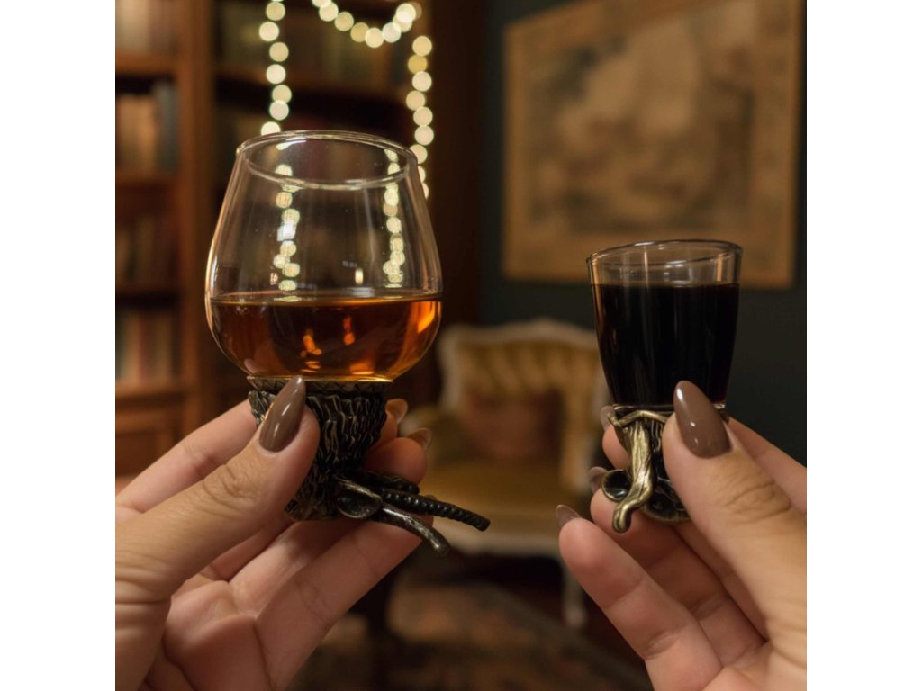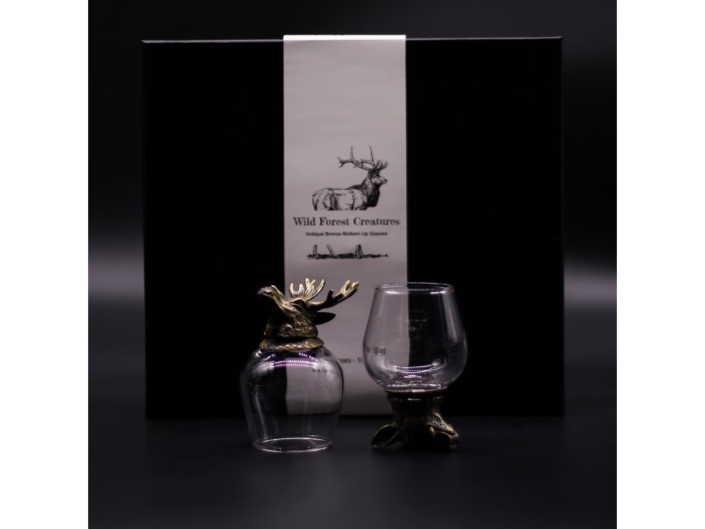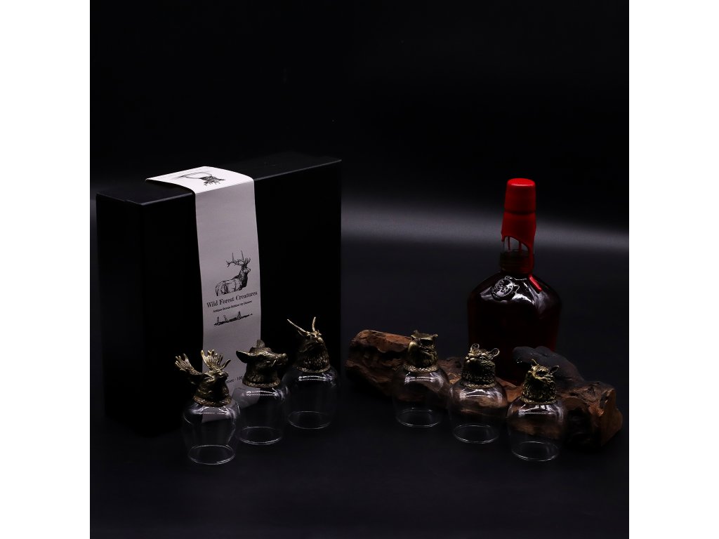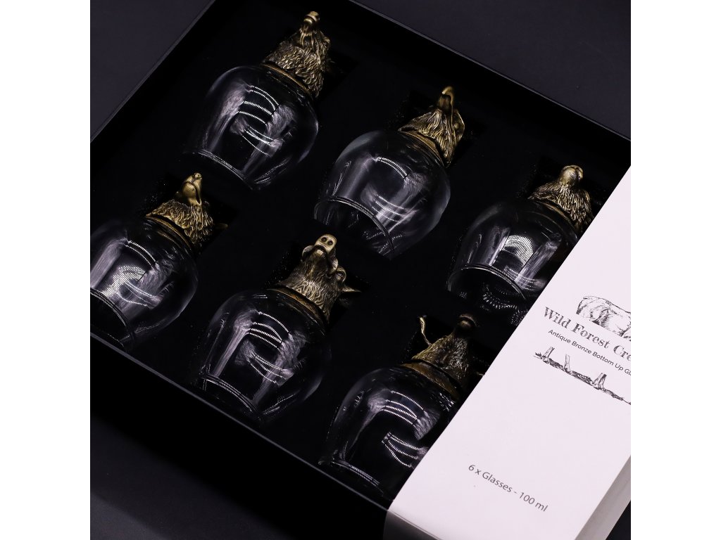 Tato 100ml sada Wild Forest Creatures, větší co do velikosti a ještě působivější v detailech, nabízí ohromující přehlídku umění a fantazie. Každá sklenice má precizně vyrobenou mosaznou základnu inspirovanou lesními zvířaty – ušlechtilým jelenem, moudrým medvědem, vznášejícím se orlem a dalšími – a proměňuje tak každodenní sklenice v něco skutečně výjimečného. Tyto sklenice jsou dekorativní i funkční, určené pro studené nápoje a k užívání jako sběratelské umělecké kousky. Sada, dodávána v černé dárkové krabičce, je elegantním dárkem pro milovníky přírody a nezbytností pro prodejce, kteří hledají výjimečné barové nádobí s ručně vyráběným vzhledem. Určeno pouze pro studené nápoje (ne do mikrovlnné trouby, myčky nádobí ani horké tekutiny).Doplňkové parametry