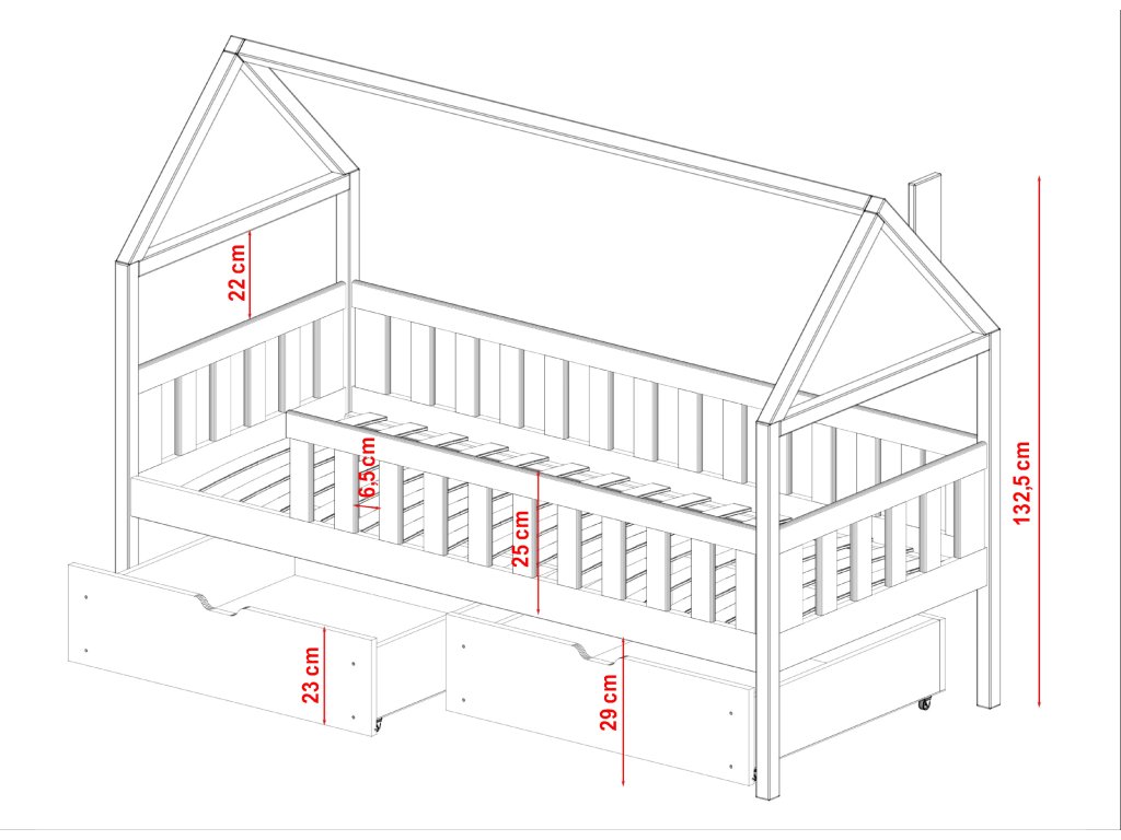 Postel bungalov Domi je návrhem do dětského pokoje. Skládá se z vlastní postele a rámu ve tvaru střechy. Celek vytváří obraz domu. Je to nejen dekorativní prvek, ale také praktický jako součást krytu moskytiéry. Rám postele je obehnán bezpečnostními zábradlími. Stabilní nohy nábytku zabraňují jeho klouzání, všechny prvky tvoří stabilní celek. Nábytek lze zakoupit v různých velikostech a zajímavých odstínech. Postel je vhodná pro svépomocnou montáž.Doplňkové parametry