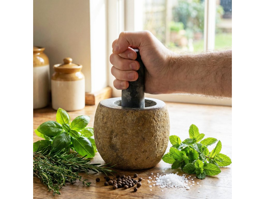 Tato malá dekorativní hmoždířová tyčinka, vyřezaná z masivního přírodního říčního kamene, je kompaktním doplňkem kuchyňského nádobí, dárkového zboží a bytových dekorací. Přirozené variace v barvě a textuře dodávají každému kusu vlastní organický charakter, takže je každý kus trochu jiný. Přirozená hmotnost a hustota říčního kamene je vhodná pro každodenní použití s bylinkami, kořením a solemi. Její jednoduchý, sochařský tvar jí také umožňuje sloužit jako dekorativní předmět na policích, pracovních deskách nebo otevřených vitrínách, což oslovuje zákazníky, kteří si cení přírodních materiálů. Menší formát se dobře hodí do omezených prostor, na dárky nebo merchandising, zatímco střední a velké velikosti pro ucelenou prezentaci. Tento kus, vyrobený v Indonésii, se pohodlně hodí do kuchyní, lifestylových, wellness a interiérových maloobchodních kolekcí.Doplňkové parametry
