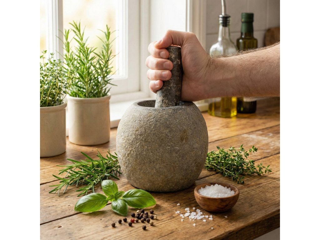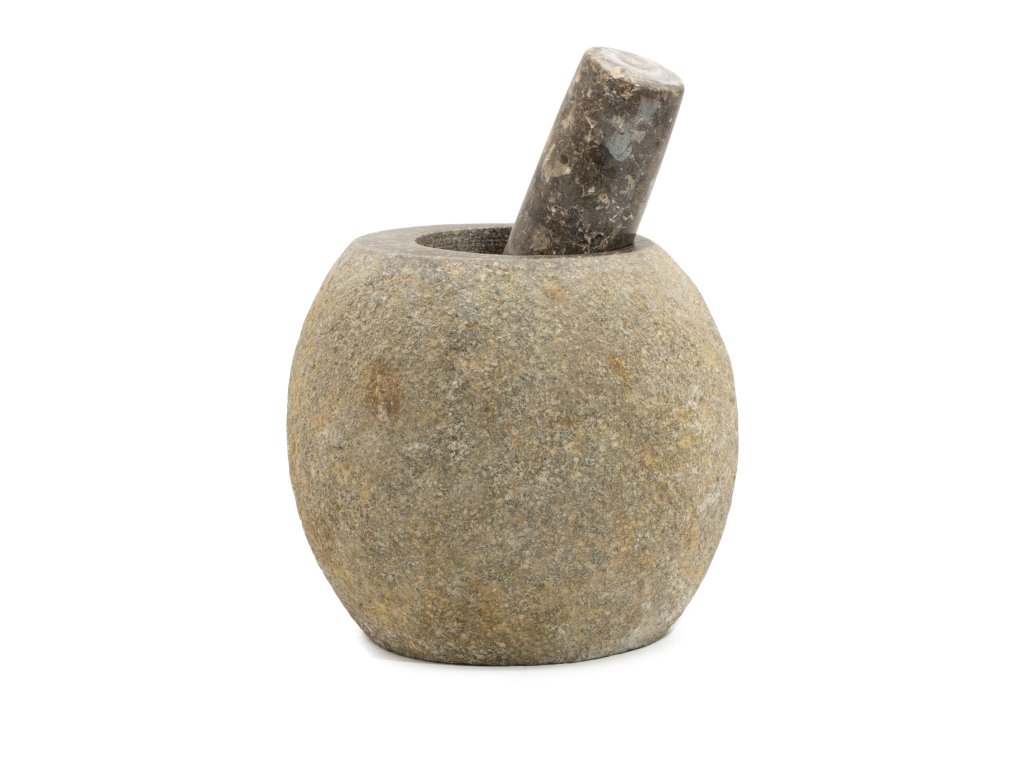 Tato velká hmoždířová miska, vyřezaná z masivního přírodního říčního kamene, je nejmajestátnějším kusem v kolekci a nabízí velkorysý objem a silný vizuální dojem. Přirozené variace v barvě, zrnitosti a povrchové struktuře zdůrazňují charakter kamene, díky čemuž je každý kus jedinečný. Díky zvýšené hmotnosti a širší míse je tato velikost vhodná pro časté používání s bylinkami, kořením a solemi. Její výrazný, sochařský tvar jí také umožňuje fungovat jako výrazný předmět, který oslovuje zákazníky, kteří oceňují praktické předměty vyrobené z přírodních materiálů. Jako největší volba v řadě je tento kus vhodný pro vystavení v různých velikostech a přirozeně se hodí k malým a středním verzím. Vyrobeno v Indonésii, pohodlně se hodí do kolekcí kuchyňského nádobí, lifestylového, wellness a bytových dekorací.Doplňkové parametry
