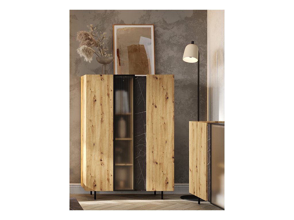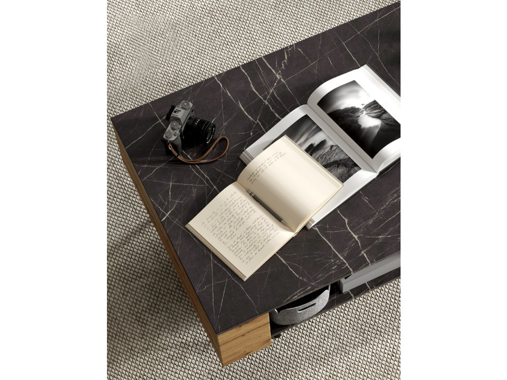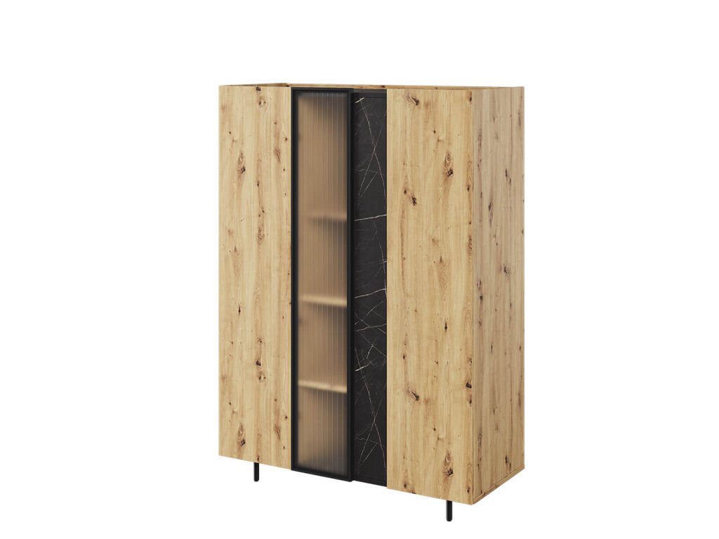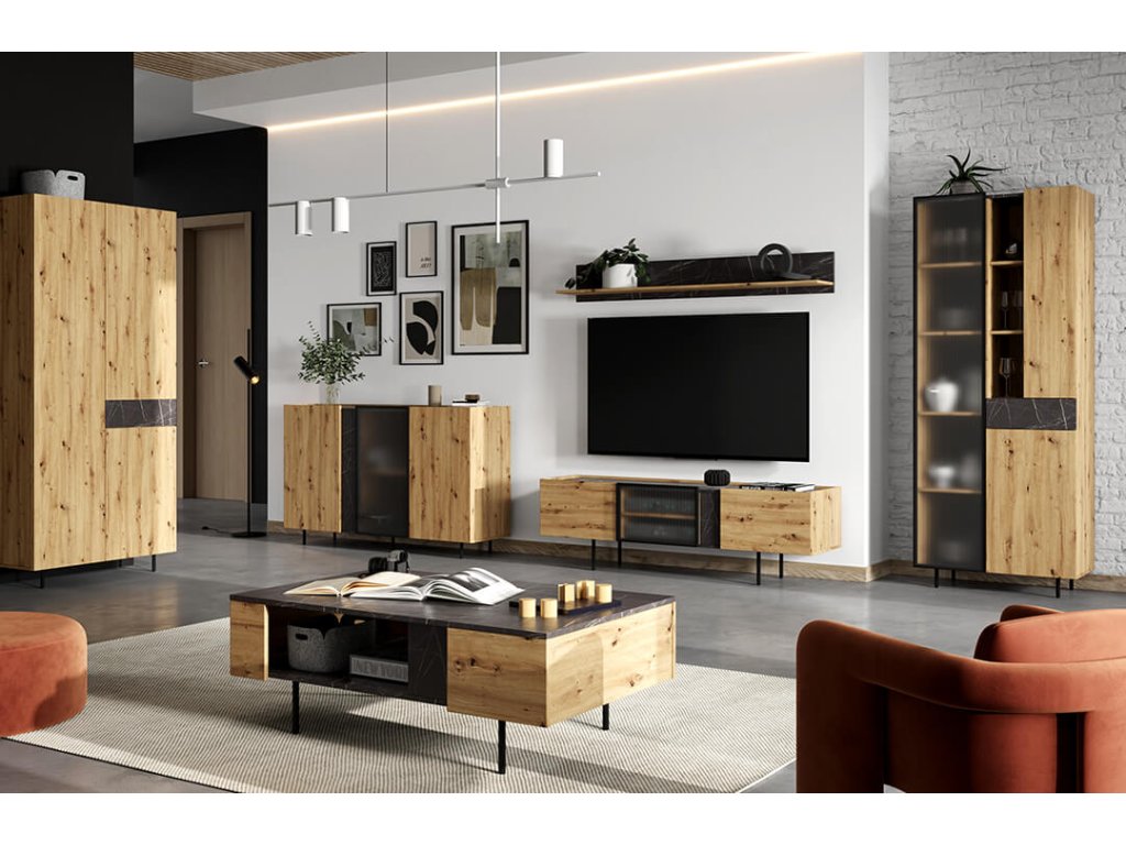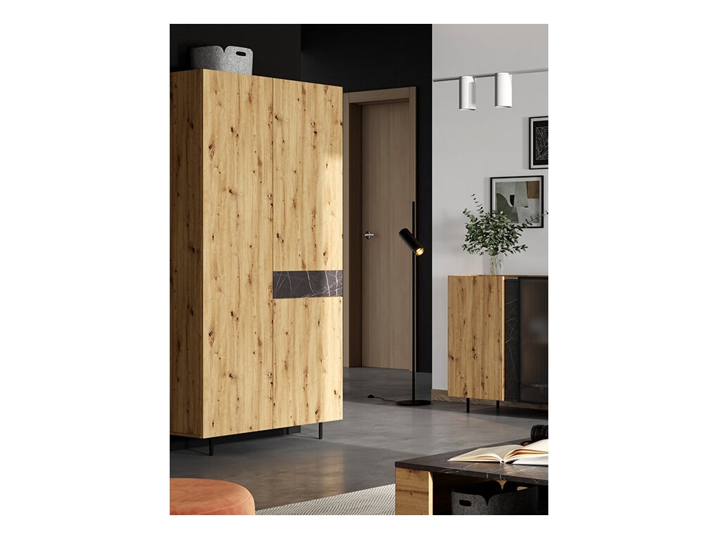 Moderní, propracovaná, jednoduchá a zároveň výrazná kolekce MARMO je promyšlena do posledního detailu. Teplý dekor dubu je kombinován s elegantním mramorovým vzorem a stylovými vysokými nožičkami v černé barvě. Nadčasovým kouskem jsou i poloprůhledná dvířka v černém rámu. Díky vyzvednutým stranám korpusu vzniká na nábytku praktický odkládací prostor. V interiéru krásně vynikne také oblíbené bezúchytové provedení. Zařiďte si interiér vkusně, nápaditě a stylově s kolekcí MARMO.