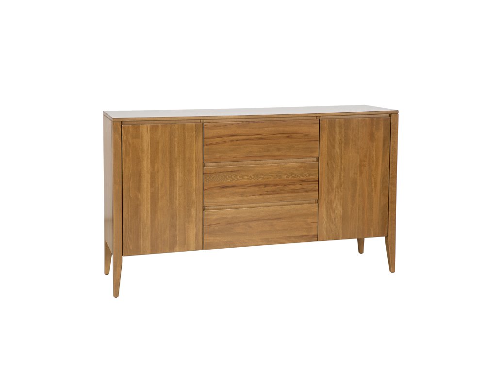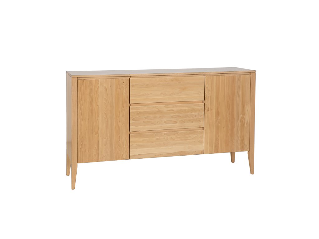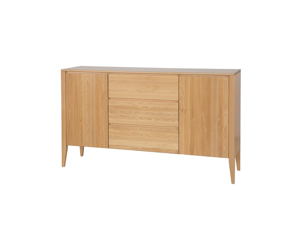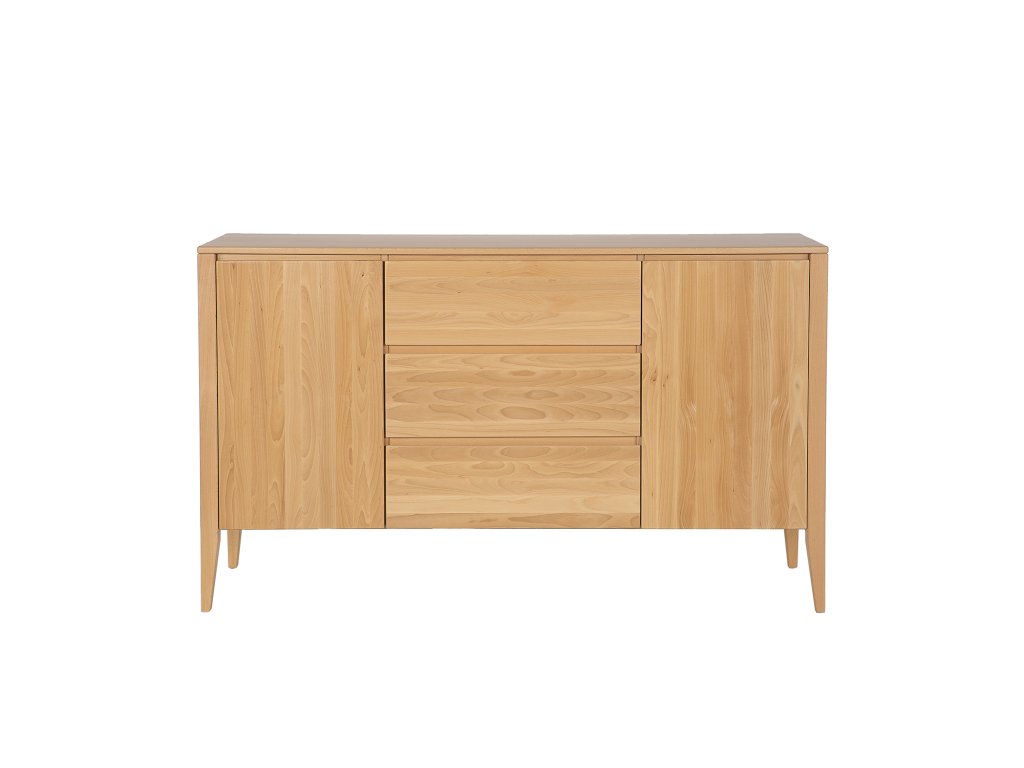 Buková komoda KD430 je novinkou z kolekce Retro. Jedná se o jeden z těch kusů nábytku, který upoutá vaši pozornost hned od dveří. Jde o spojení moderny s nádechem vintage stylu. Jednoduchý masivní korpus nábytku byl umístěn na vysokých nohách, které celé konstrukci dodaly lehkost. Nádherná buková čela zásuvek a skříněk zdobí subtilní, vyřezávané dřevěné úchytky, vytvářející moderní systém otevírání a zavírání. Celek doplňuje velká dřevěná stolní deska, kterou lze využít k vystavení rodinných fotografií nebo suvenýrů. V každé skříňce je jedna police.