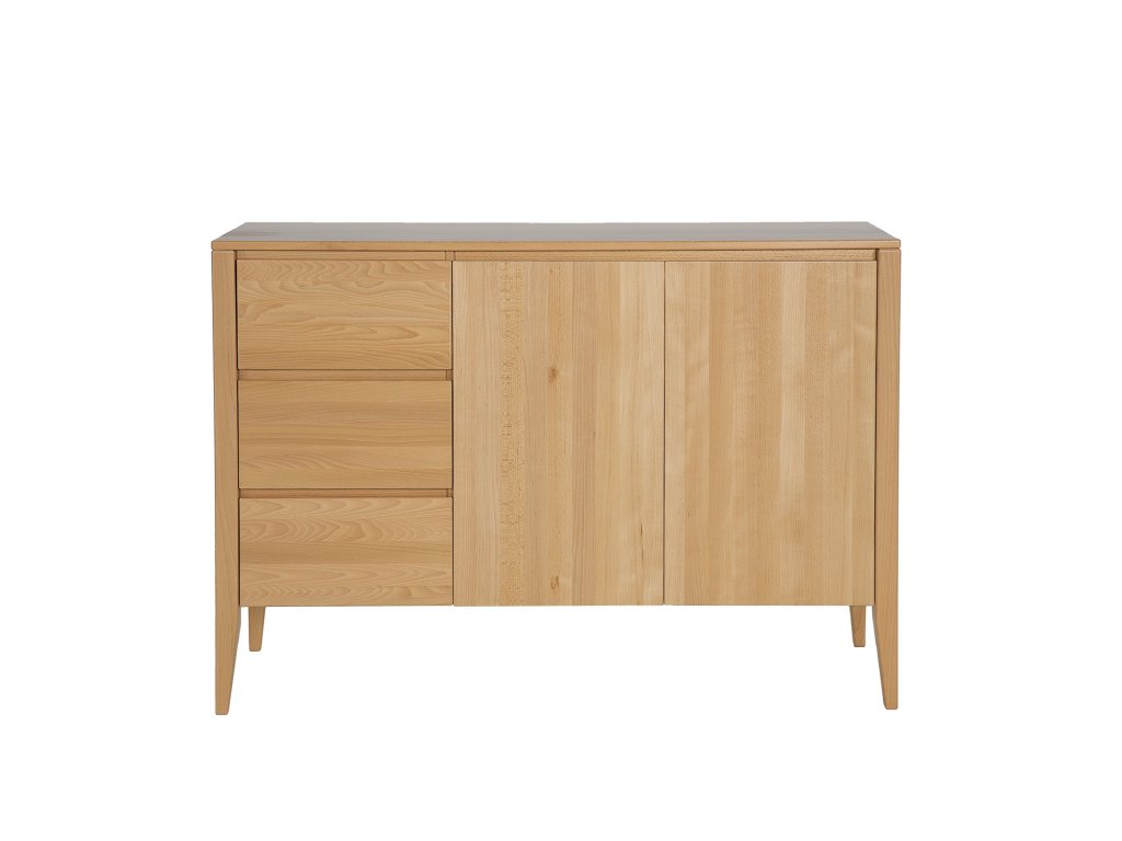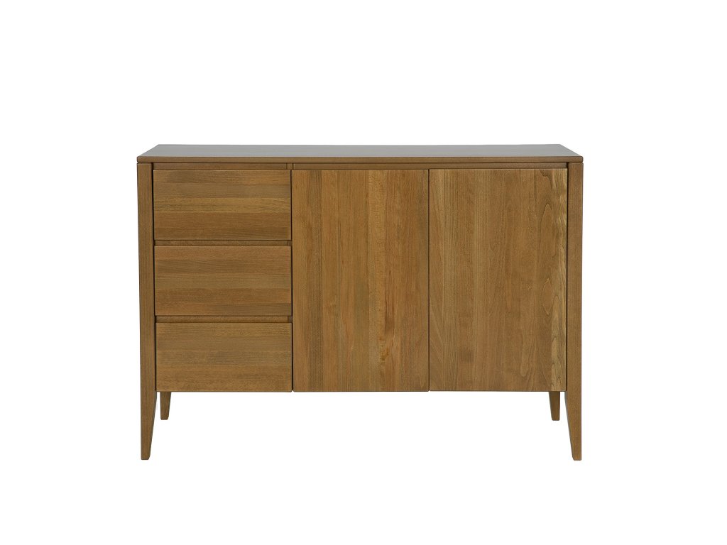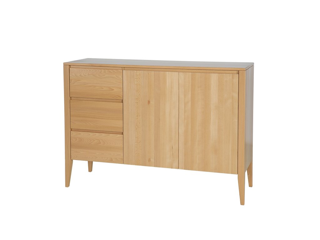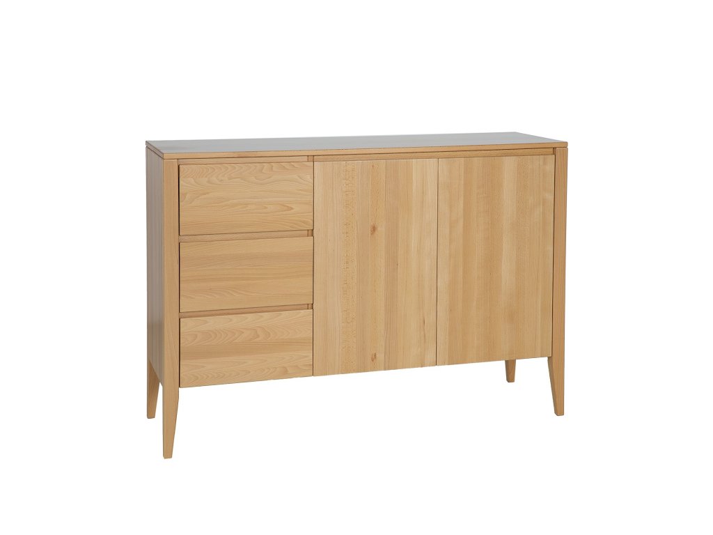Buková komoda KD439 je novinkou z kolekce Retro. Jedná se o jeden z těch kusů nábytku, který upoutá vaši pozornost hned od dveří. Jde o spojení moderny s nádechem vintage stylu. Jednoduchý masivní korpus nábytku byl umístěn na vysokých nohách, které celé konstrukci dodaly lehkost. Nádherná buková čela zásuvek a skříněk zdobí subtilní, vyřezávané dřevěné úchytky, vytvářející moderní systém otevírání a zavírání. Celek doplňuje velká dřevěná stolní deska, kterou lze využít k vystavení rodinných fotografií nebo suvenýrů. Ve skříni je jedna police.
