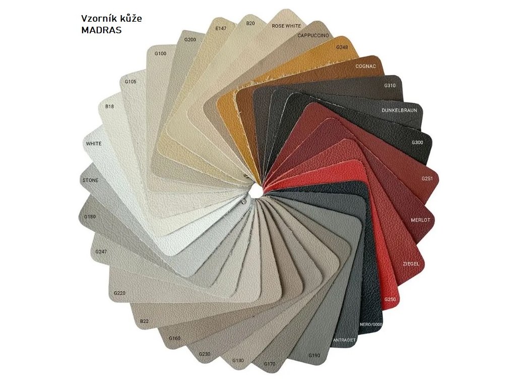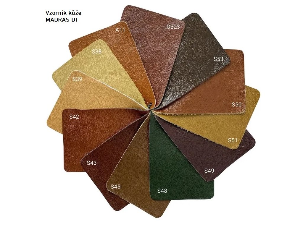 Dostupných několika barevných provedení kůže a dřeva, k dispozici výběr ze 3 vzorníků kůže - MADRAS, MADRAS DT a PASSIONE a 1 vzorník dřeva (ke kombinovaným sedačkám kůže+dřevo) - zvětšené naleznete na konci fotogalerie po rozkliknutí. V případě zájmu Vám pošleme na adresu vzorníky tohoto výrobce, abyste měli možnost si doma v klidu porovnat barevné provedení a kvalitu kůže. Za zapůjčení vzorníku se platí 600,- Kč jako vratná záloha. Zapůjčení vzorníků jsi můžete objednat zde: https://www.brahmashop.cz/vzorniky-pyka/