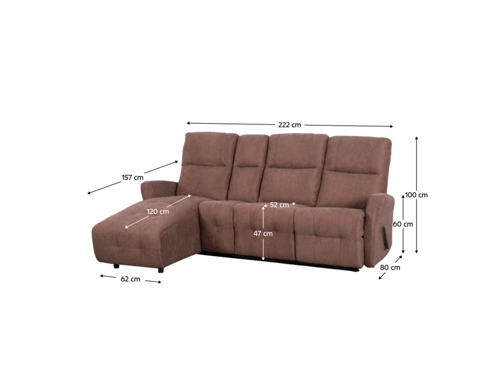 Materiál: látka/kov Oděruodolnost textilie podle testu Martindale: 20 000 oděrů Barva: hnědá Rozměry (ŠxHxV): 222x80x100 cm Výška sedu: 47 cm Hloubka sedu: 52 cm Výška područky: 60 cm Hloubka otomanu: 120 cm Šířka otomanu: 62 cm Nosnost: 100 kg Výplň: pružina falista+Pur pěna Levé provedení Rohová Celočalouněná Nastavitelná S funkcí polohování pravé strany Mechanické polohování Podnož vysunete pomocí páčky Sklápěcí držák na občerstvení Dodáváno v demontuBalení (počet kusů : 2)