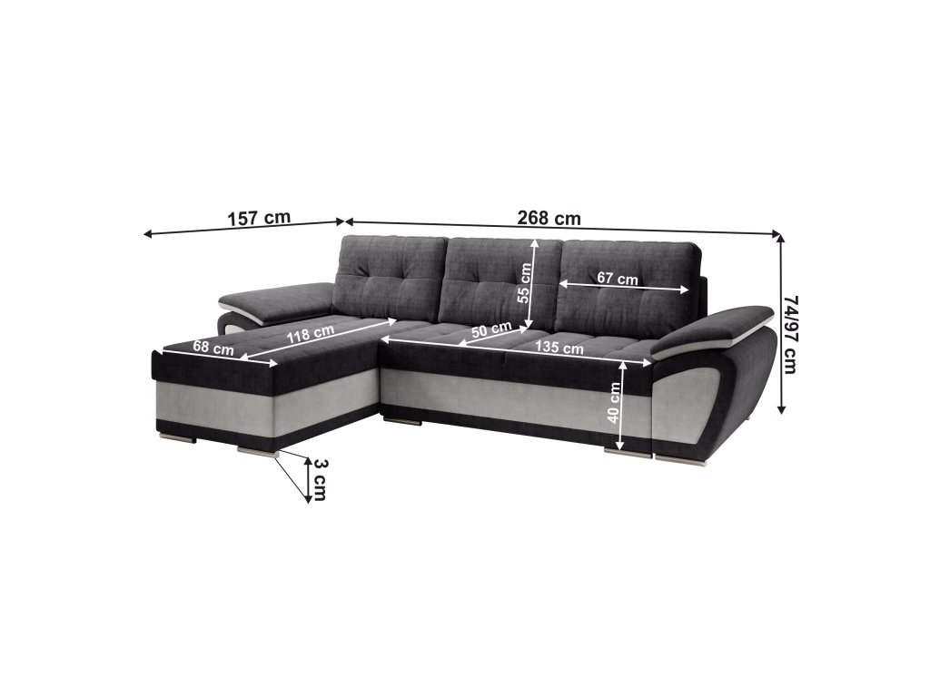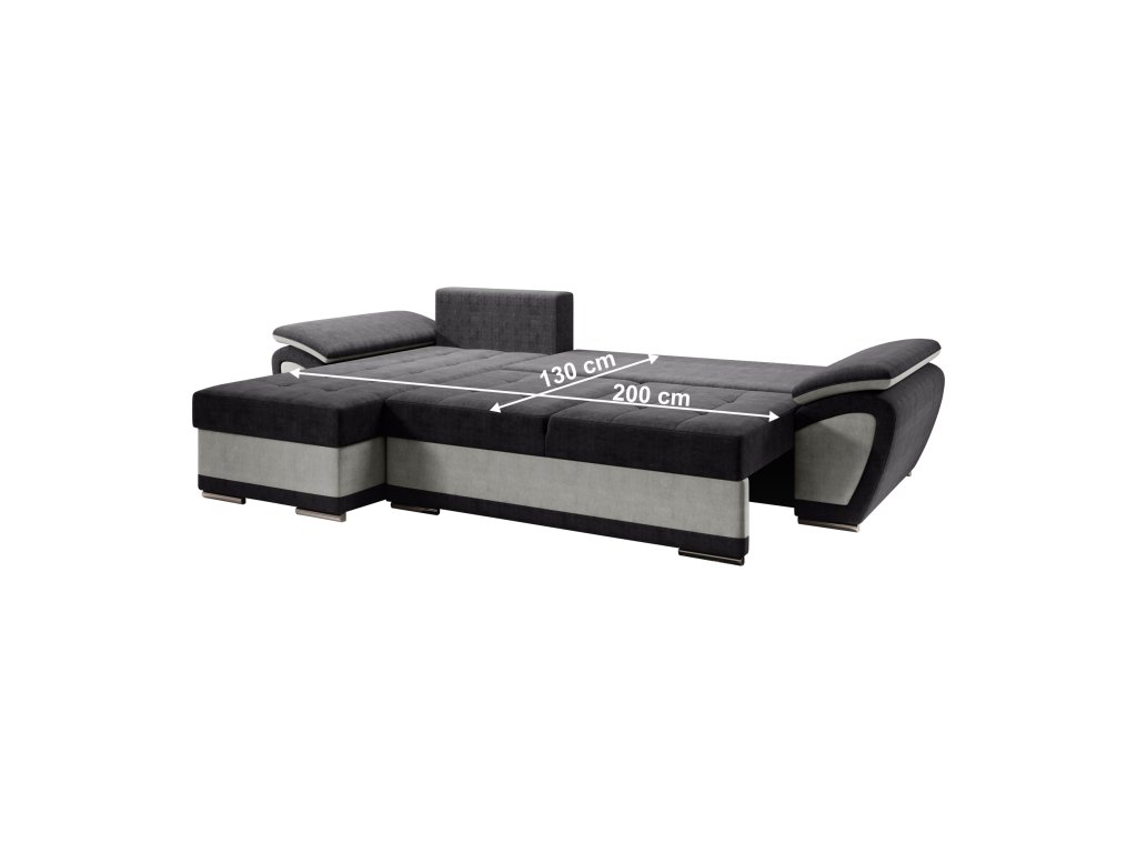 Materiál: látka Orinoco 90/96 Oděruodolnost textilie podle testu Martindale: 72 000 oděrů Barva: světle šedá/tmavě šedá Rozměry (ŠxHxV): 268x157x97 cm Výška sedu: 40 cm Hloubka sedu: 50 cm Výška spodního prostoru od podlahy: 3 cm Rozkládací Plocha na spaní (ŠxD): 130x200 cm Výška opěrky na záda: 50 cm Rozměry otomanu (ŠxH): 68x118 cm Opěrka na ruku (ŠxH): 31x90 cm Nosnost na osobu: 90 kg Rohová S úložným prostorem Dekorativní prošití Výplň: pružina falista/pur pěna Na plastových nožičkách Barva nožiček: stříbrná Celočalouněná Levé provedení Dodáváno se třemi polštáři Rozměry polštářů (ŠxH): 67x55 cm Dodáváno v demontuBalení (počet kusů : 3)
