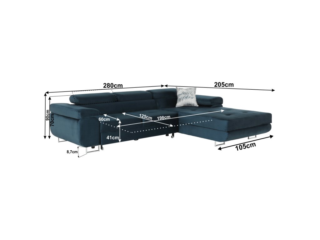 ;"Materiál: látka Monolith Oděruodolnost textilie podle testu Martindale: 100 000 oděrek Barva: 77 modrá / vzor Rozměry (ŠxHxV): 280x205x70 / 90 cm Výška sedu: 41 cm Hloubka sedu: 60 cm Plocha na spaní (ŠxD): 125x198 cm Výška spodního prostoru od podlahy: 8,7 cm Šířka otomanu: 105 cm Nosnost: 90 kg pravé provedení Pružinová výplň celočalouněná rozkládací S úložným prostorem Dekorativní šití sedáku 3 polohovací opěrky hlavy 6 stupňovové polohování opěrek automatické polohy S úložným prostorem Dodávané s polštářkem Dodávané v demontu Možnost objednání v 5 barevných provedeních Monolith v ceně 31.790 Kč. Při individuální objednávce je třeba zaplatit 20% zálohu z dané částky. Po uhrazení zálohy bude Vaša objednávka zadána do výroby. Dodací doba 6-8 týdnů.Balení (počet kusů : 2)