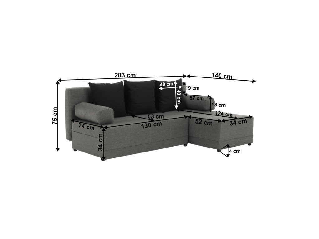 Materiál: látka Oděruodolnost textilie podle testu Martindale: 59 000 oděrů Barva: šedá/černá Rozměry: ŠxHxV: 203x140x75 cm Plocha na spaní: ŠxD: 127x203 cm Výška sedu: 37 cm Hloubka sedu: 53/74 cm Výška spodního prostoru od podlahy: 4 cm Polštář (ŠxV): 40x40 cm 3+2 polštáře Nosnost na osobu: 90 kg Tři opěrkové polštáře Dva polštáře zastupující opěrky na ruce Rohová Pravé provedení Výplň: molitán S úložným prostorem Dekorativní šití Dodávána v demontu Možnost objednání z vyobrazených barevných provedení v ceně 13.790 Kč.Při individuální objednávce je třeba zaplatit 20% zálohu z dané částky. Po uhrazení zálohy bude Vaša objednávka zadána do výroby. Doba dodání 6-8 týdnů.Balení (počet kusů : 3)