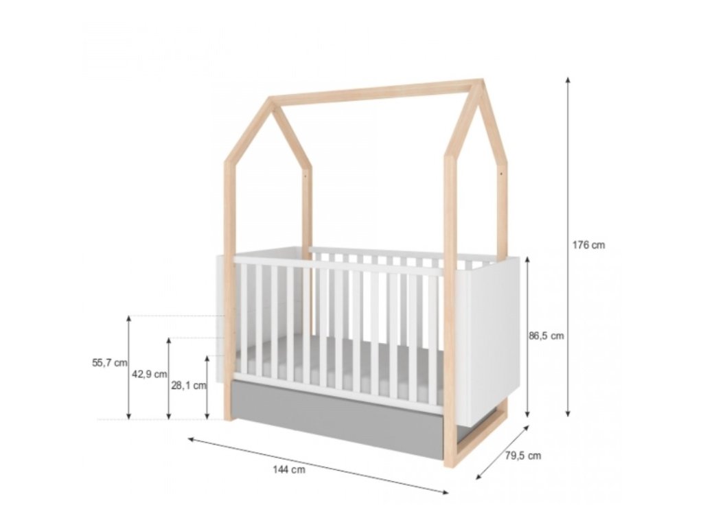 - tři vodorovné polohy matrace přizpůsobené vývoji dítěte (55,6 / 42,8 / 25,2 cm od podlahy)