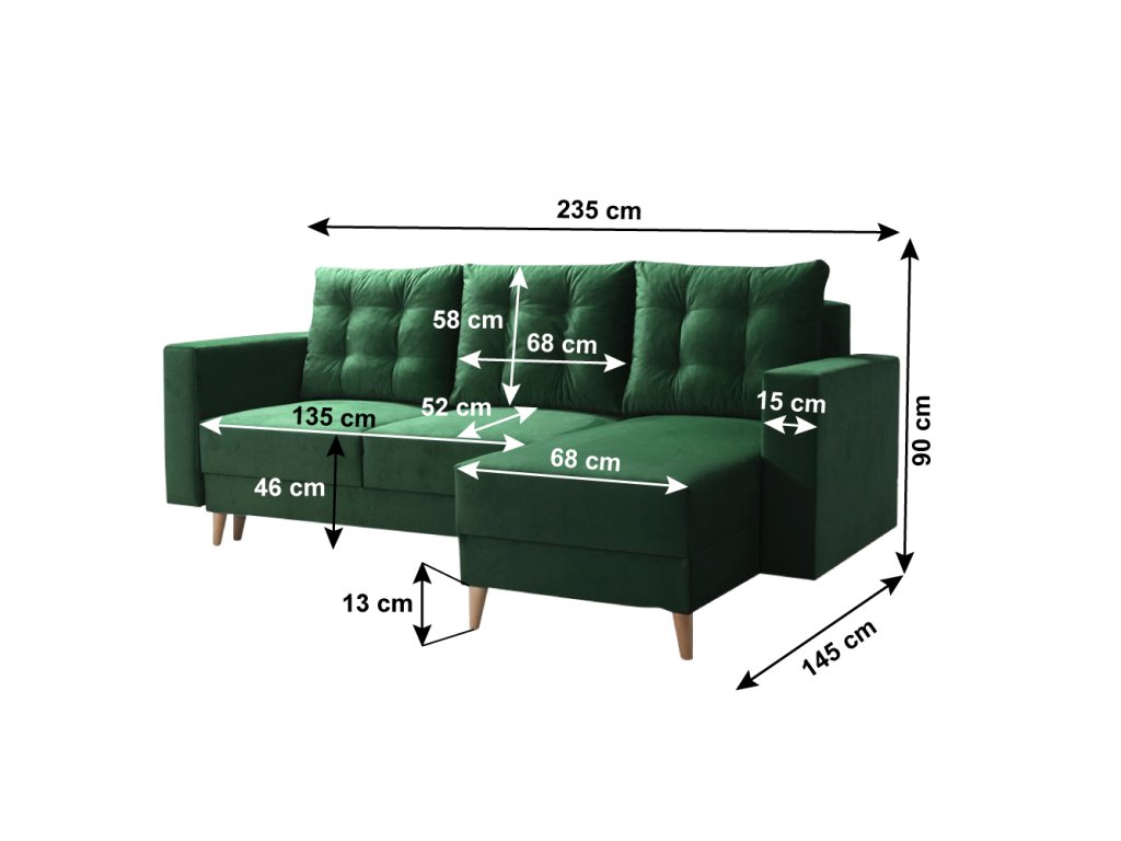 Materiál čalounění: látka Kronos 19 Oděruodolnost látky podle testu Martindale: 60 000 Barva čalounění: zelená Rozměry (ŠxHxV): 235x145x90 cm Plocha na spaní (ŠxD): 130x200 cm Výška sedu: 46 cm Hloubka sedu: 52 cm Šířka otomanu: 68 cm Šířka sedáku: 135 cm Šířka opěrky na ruku: 15 cm Výška spodního prostoru od podlahy: 13 cm Na dřevěných nožičkách Barva nožiček: buk Nosnost na osobu: 90 kg Výplň: pružina falista + Pur pěna Dodávána se třemi polštáři Rozměry polštářů (ŠxV): 68x58 cm Rozkládací Rohová Celočalouněná S úložným prostorem Pravé provedení Dodáváno v demontuBalení (počet kusů : 3)