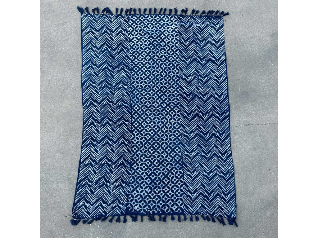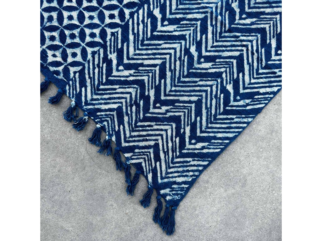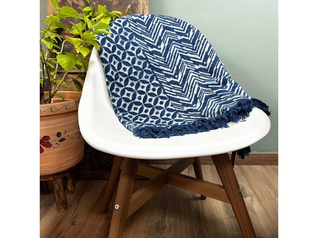 Naše ručně vyráběné indigové přehozy jsou přivedeny k životu pečlivým a časem prověřeným procesem. Mistři řemeslníci ponořují látku do přírodních indigových barvicích lázní, vrstvu po vrstvě, aby dosáhli hlubokých, zářivých modrých odstínů, které definují indigové textilie. Různé odporové techniky, jako je kravaty, blokový tisk nebo batika, se používají k vytváření složitých vzorů na látce a přeměňují ji na plátno uměleckého vyjádření. Obarvená látka je šetrně vysušena na slunci, což umožňuje indigu projít oxidací a postupně odhalit svůj ikonický modrý odstín, zářící jako indická obloha. Každý přehoz je láskyplně zakončen ručně šitou výšivkou nebo ozdoben střapci, což každému kousku dodává punc autenticity a individuality. Tyto přehozy přesahují pouhé textilie; jsou to kulturní a tradiční poklady, které Vás zaujmou a pozvednou Vaše životní prostory. Přidejte se k nám a oslavte umění barvení indigem a nadčasovou krásu, kterou propůjčuje světu bytových dekorací.