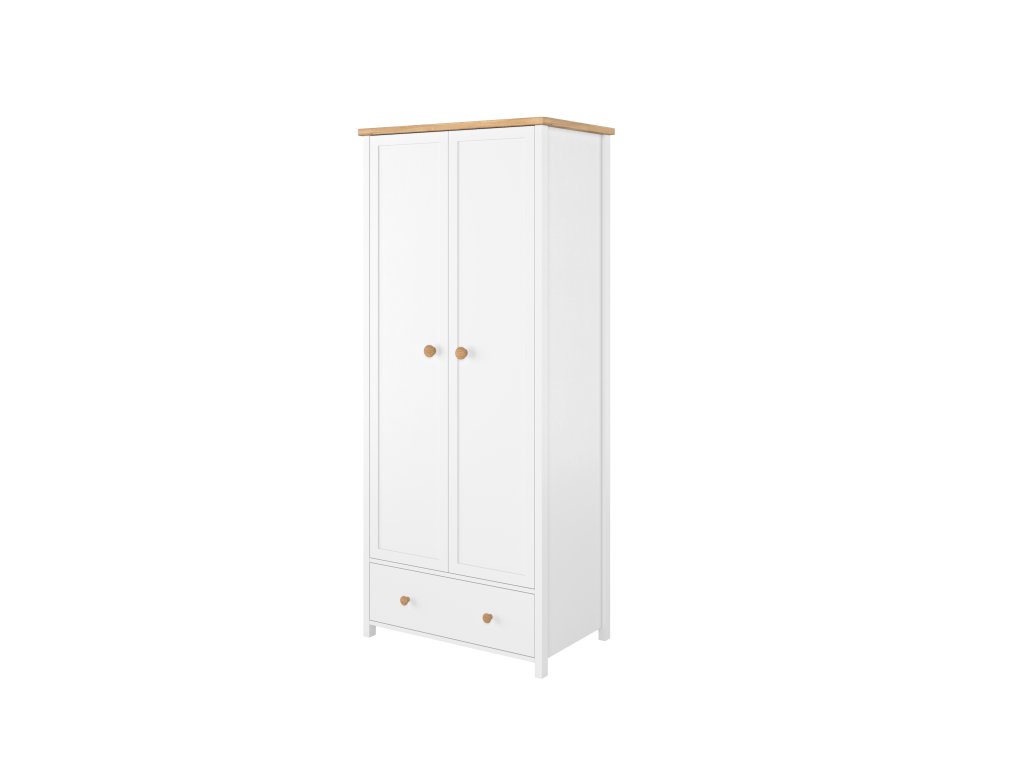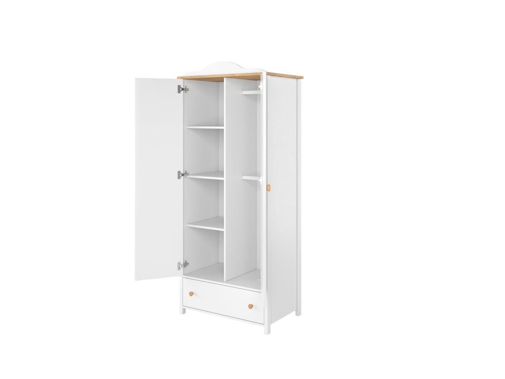 Šatní skříň STORY je dvoudveřová, má 2 šatní tyče, police a 1 zásuvku.