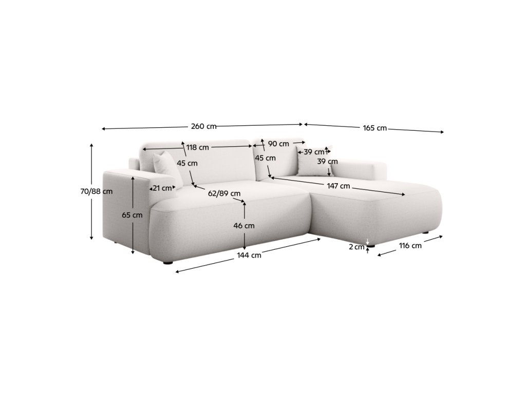 Materiál čalounění: látka Lambi 07 Oděruodolnost látky podle testu Martindale: 50 000 oděrů Barva čalounění: bílá Rozměry (ŠxHxV): 260x165x70/88 cm Plocha na spaní (ŠxD): 130x215 cm Výška sedu: 46 cm Hloubka sedu: 62/89 cm Rozměry opěrky na ruku (ŠxV): 21x65 cm Rozměry otomanu (ŠxH): 116x147 cm Šířka sedáku: 144 cm Výška spodního prostoru od podlahy: 2 cm Na nožičkách Materiál nožiček: plast Výplň: bonelová pružina/HR pěna Rozkládací Rohová Celočalouněná Pravé provedení Dodáváno s dekorativními polštářky S úložným prostorem Dodáváno v demontu Možnost objednání v 6 barevných odstínech látky Lambi v ceně 28.750 Kč s dodací lhůtou 6-8 týdnů. Při individuální objednávce je třeba zaplatit 20% zálohu z dané částky. Po uhrazení zálohy bude Váš požadavek zadán do výroby.Balení (počet kusů : 2)