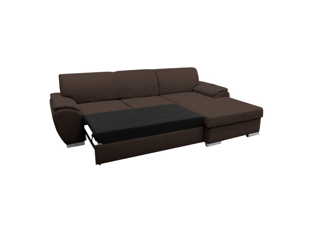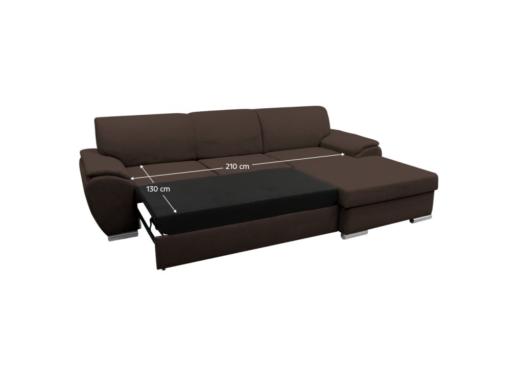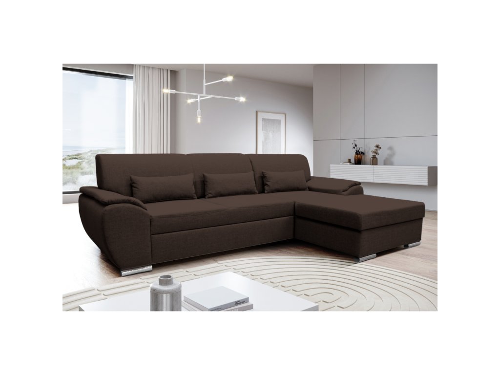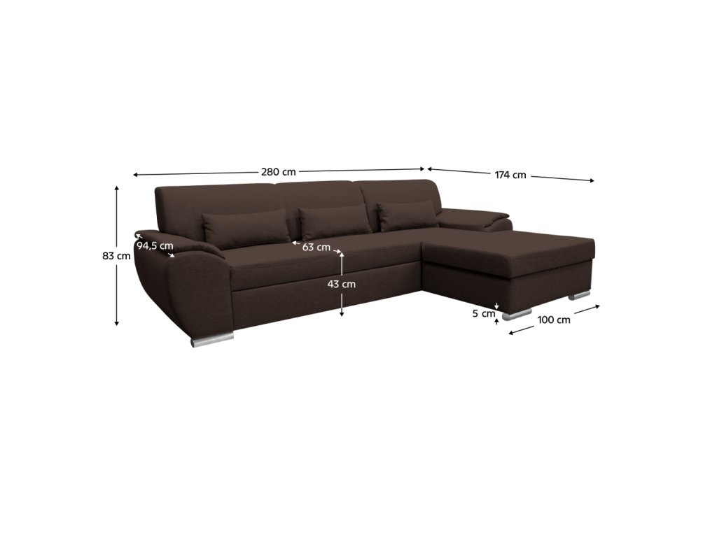 Materiál: látka Malmo 26 Oděruodolnost textilie podle testu Martindale: 30 000 oděrů Barva: hnědá Rozměry (ŠxHxV): 280x174x83 cm Plocha na spaní (ŠxD): 130x210 cm Výška sedu: 43 cm Hloubka sedu: 63 cm Výška spodního prostoru od podlahy: 5 cm Plastové nožičky Barva nožiček: stříbrná 3 dekorativní polštáře Výplň: pružina/pur pěna Celočalouněná Rohová Rozkládací S úložným prostorem Pravé provedení Dodáváno v demontuBalení (počet kusů : 2)