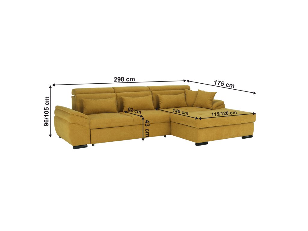 ;"Materiál: látka Alfa 120 Oděruodolnost textilie podle testu Martindale: 55 000 oděrek Barva: 120 hořčicová Rozměry (ŠxHxV): 298x175x96 / 105 cm plocha na spaní (ŠxD): 125x220 cm Výška sedu: 43 cm Hloubka sedu: 62 cm Výška spodního prostoru od podlahy: 5 cm Šířka otomanu: 115/120 cm Hloubka otomanu: 140 cm Nosnost na osobu: 90 kg celočalouněná rohová rozkládací S úložným prostorem Dodávána s polštáři S polohovacími opěrkami hlavy 5 polohovacích opěrek pravé provedení Dodávané v demontu. Možnost objednání v 8 barevných provedeních látky Alfa v ceně 41.590 Kč. Při individuální objednávce je třeba zaplatit 20% zálohu z dané částky. Po uhrazení zálohy bude Vaša objednávka zadána do výroby. Dodací lhůta 6-8 týdnů.Balení (počet kusů : 2)
