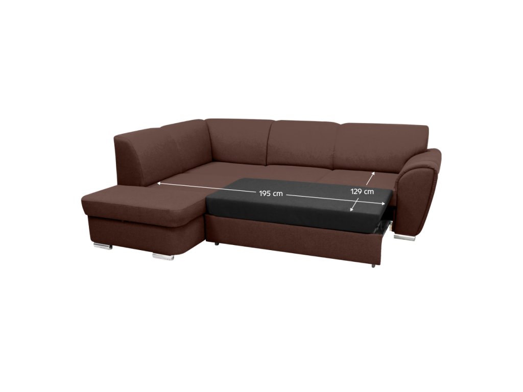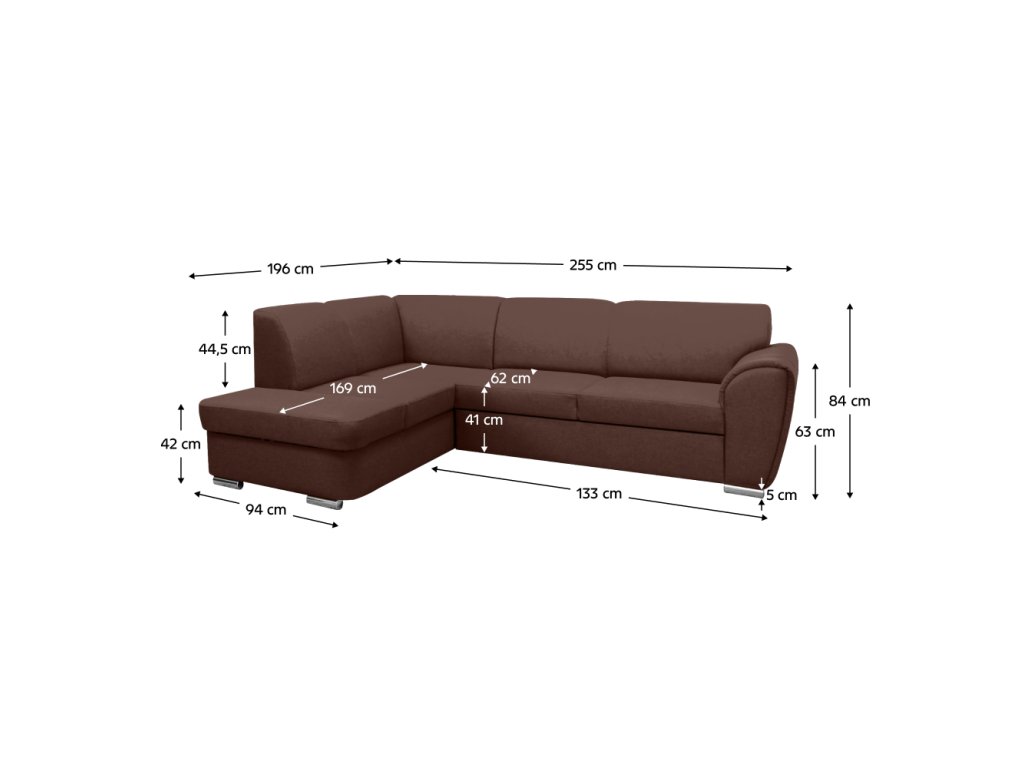 Materiál: látka Malmo 26 Oděruodolnost textilie podle testu Martindale: 30 000 oděrů Barva: hnědá Rozměry (ŠxHxV): 255x196x84 cm Plocha na spaní (ŠxD): 129x195 cm Výška sedu: 41 cm Hloubka sedu: 62 cm Výška zádové opěrky: 44,5 cm Šířka sedáku: 133 cm Rozměry otomanu (ŠxH): 94x169 cm Výška spodního prostoru od podlahy: 5 cm Výška opěrky na ruku: 63 cm Výplň: pružina Falistra/PUR pěna Plastové nožičky Barva nožiček: stříbrná Celočalouněná Rozkládací Rohová Levé provedení Úložný prostor Dodáváno v demontuBalení (počet kusů : 2)