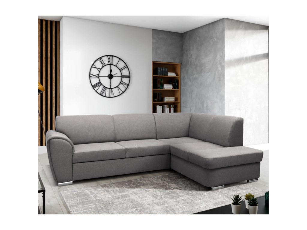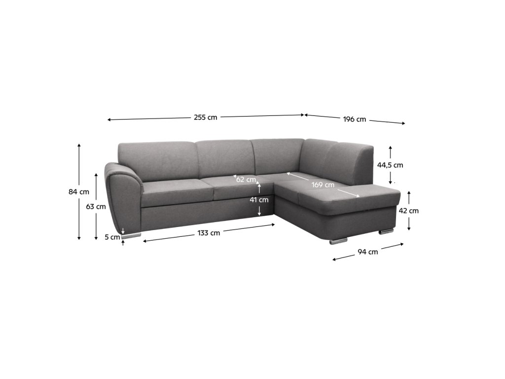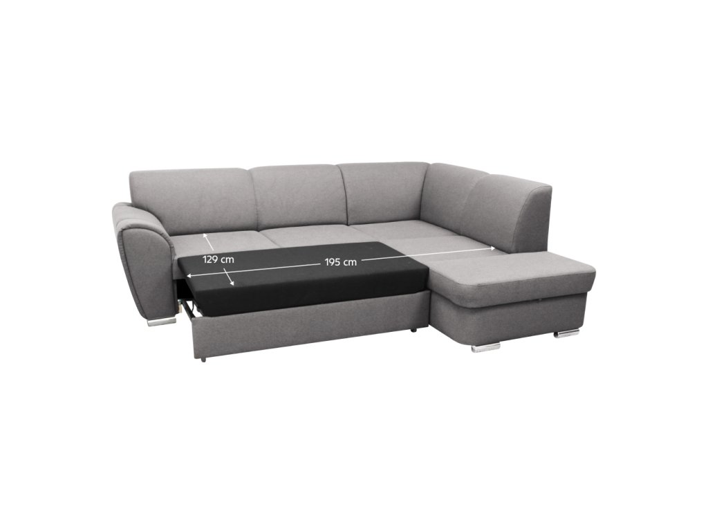 Materiál: látka Malmo 90 Oděruodolnost textilie podle testu Martindale: 30 000 oděrů Barva: šedá Rozměry (ŠxHxV): 255x196x84 cm Plocha na spaní (ŠxD): 129x195 cm Výška sedu: 41 cm Hloubka sedu: 62 cm Výška zádové opěrky: 44,5 cm Šířka sedáku: 133 cm Rozměry otomanu (ŠxH): 94x169 cm Výška spodního prostoru od podlahy: 5 cm Výška opěrky na ruku: 63 cm Výplň: pružina Falistra/PUR pěna Plastové nožičky Barva nožiček: stříbrná Celočalouněná Rozkládací Rohová Pravé provedení Úložný prostor Dodáváno v demontuBalení (počet kusů : 2)
