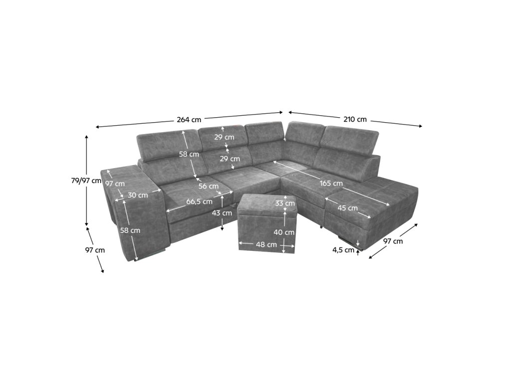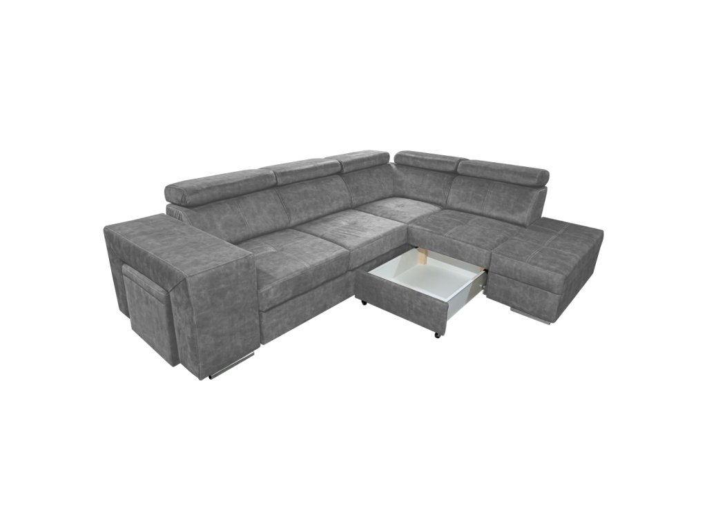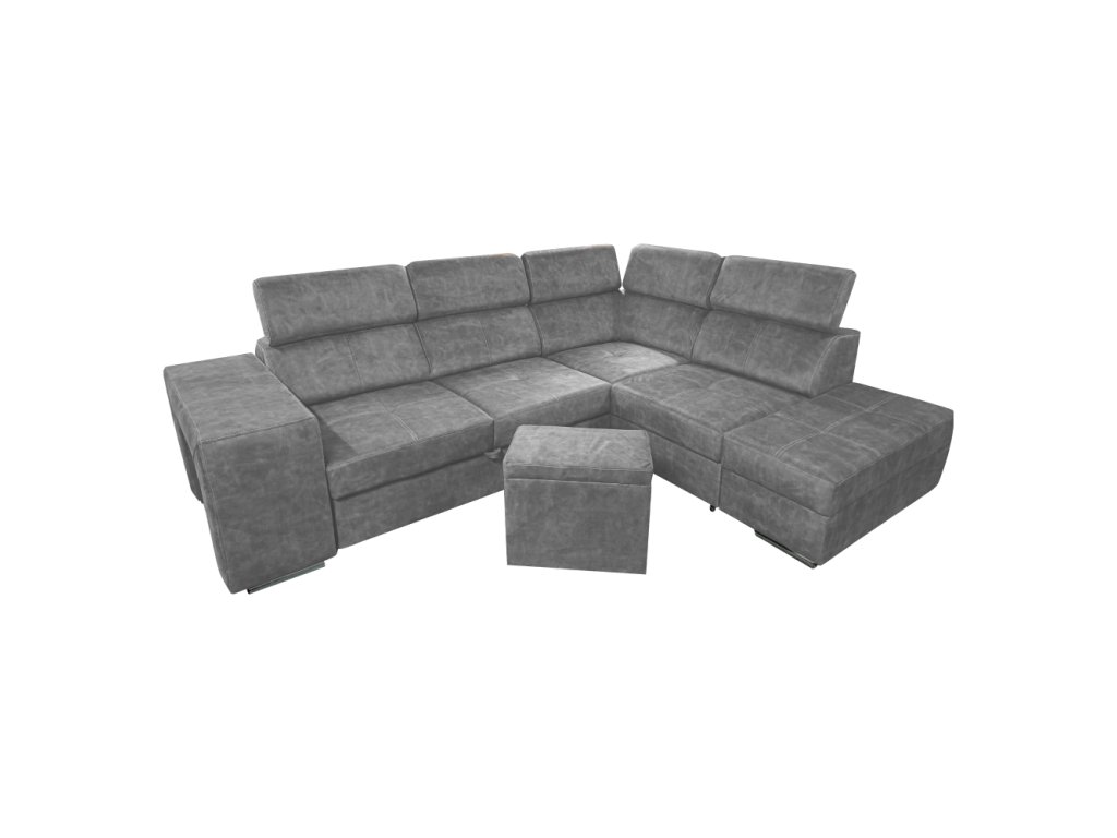 Materiál čalounění: látka Country 17 Oděruodolnost textilie podle testu Martindale: 65 000 oděrů Barva: šedá Materiál konstrukce: borového dřeva/bukového dřeva/laminátová deska Rozměry (ŠxHxV): 264x210x79/97 cm Plocha na spaní (ŠxD): 130x190 cm Výška sedu: 43 cm Hloubka sedu: 56 cm Rozměry otomanu (ŠxH): 97x165 cm Rozměry opěrky na ruku (ŠxHxV): 30x97x58 cm S taburetem Rozměry taburetu (ŠxHxV): 40x33x48 cm Celočalouněná Rozkládací Rohová S úložným prostorem Pravé provedení Na nožičkách Barva nožiček: chromová Výška spodního prostoru od podlahy: 4,5 cm Polohovací opěrky hlavy 5 stupňové polohování opěrek Výplň: pružina falista/pur pěna/molitan Dodáváno v demontu Možnost objednání v 8 barevných odstínech látky Country v ceně 35 990 Kč. s dodací lhůtou 6-8 týdnů. Při individuální objednávce je třeba zaplatit 20% zálohu z dané částky. Po uhrazení zálohy bude Váš požadavek zadán do výroby.Balení (počet kusů : 3)