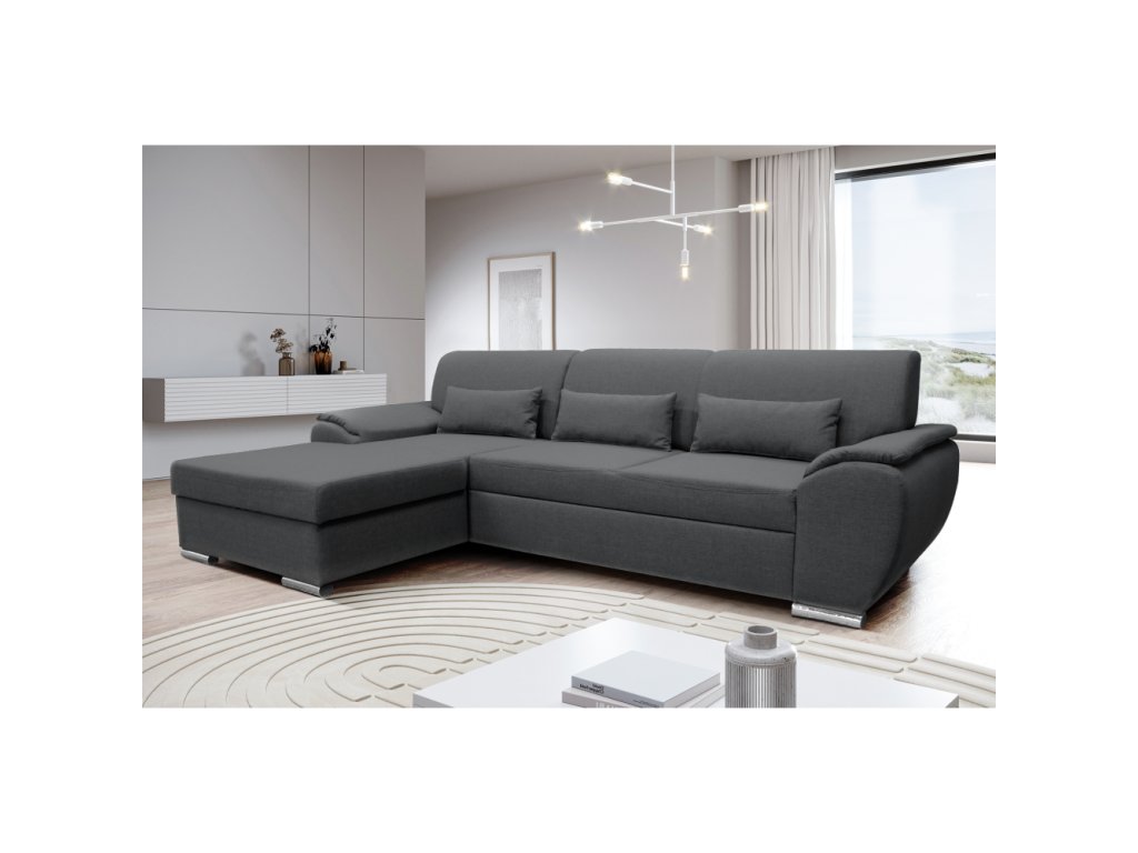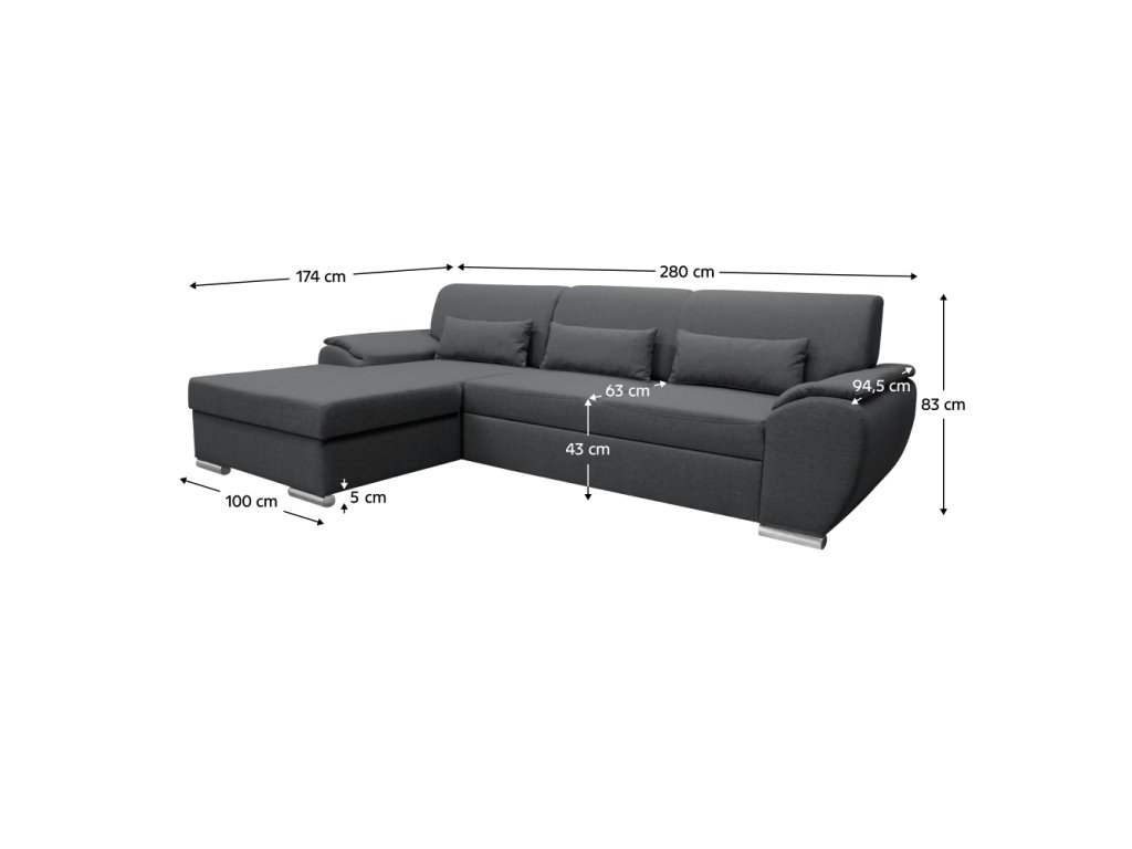 Materiál: látka Malmo 95 Oděruodolnost textilie podle testu Martindale: 30 000 oděrů Barva: šedá Rozměry (ŠxHxV): 280x174x83 cm Plocha na spaní (ŠxD): 130x210 cm Výška sedu: 43 cm Hloubka sedu: 63 cm Výška spodního prostoru od podlahy: 5 cm Plastové nožičky Barva nožiček: stříbrná 3 dekorativní polštáře Výplň: pružina/pur pěna Celočalouněná Rohová Rozkládací S úložným prostorem Levé provedení Dodáváno v demontuBalení (počet kusů : 2)