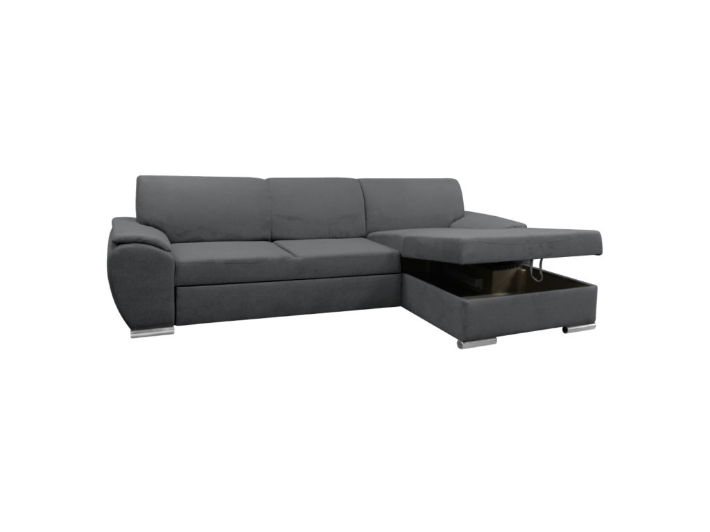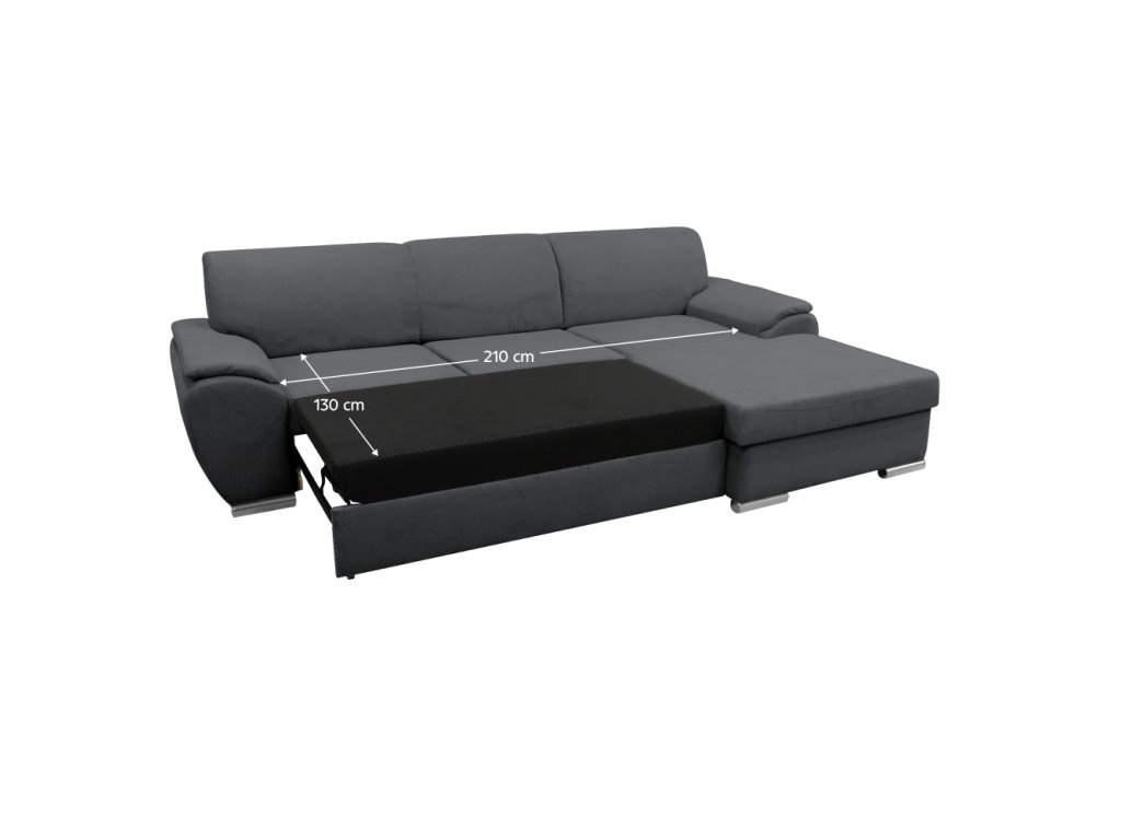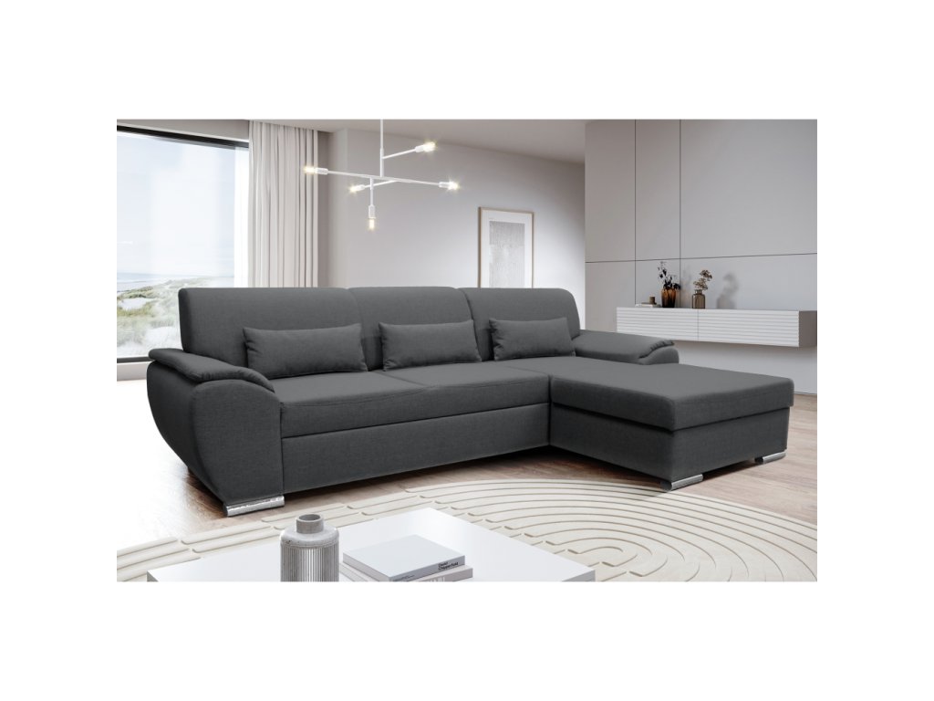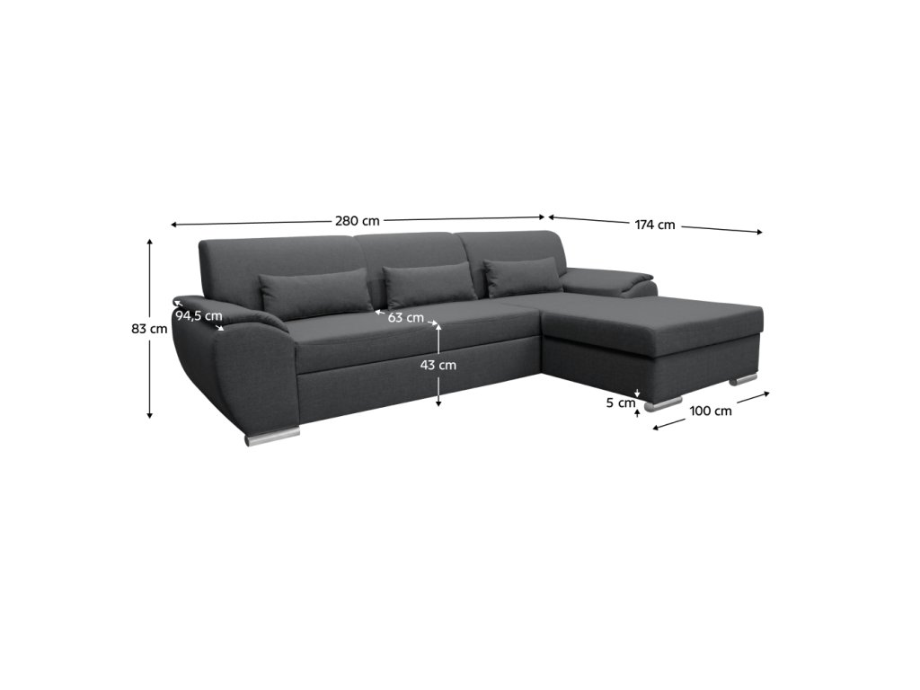 Materiál: látka Malmo 95 Oděruodolnost textilie podle testu Martindale: 30 000 oděrů Barva: šedá Rozměry (ŠxHxV): 280x174x83 cm Plocha na spaní (ŠxD): 130x210 cm Výška sedu: 43 cm Hloubka sedu: 63 cm Výška spodního prostoru od podlahy: 5 cm Plastové nožičky Barva nožiček: stříbrná 3 dekorativní polštáře Výplň: pružina/pur pěna Celočalouněná Rohová Rozkládací S úložným prostorem Pravé provedení Dodáváno v demontuBalení (počet kusů : 2)