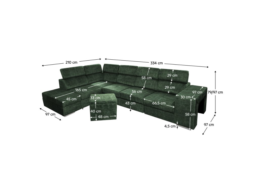 Materiál čalounění: látka Country 11 Oděruodolnost textilie podle testu Martindale: 65 000 oděrů Barva: smaragdová Materiál konstrukce: borové dřevo/bukové dřevo/laminátová deska Rozměry (ŠxHxV): 334x210x79/97 cm Plocha na spaní (ŠxD): 130x190 cm Výška sedu: 43 cm Hloubka sedu: 56 cm Rozměry otomanu (ŠxH): 97x165 cm Rozměry opěrky na ruku (ŠxHxV): 30x97x58 cm S taburetem Rozměry taburetu (ŠxHxV): 40x33x48 cm Celočalouněná Rozkládací Rohová S úložným prostorem Levé provedení Na nožičkách Barva nožiček: chromová Výška spodního prostoru od podlahy: 4,5 cm Polohovací opěrky hlavy 5 stupňové polohování opěrek Výplň:pružina falista/pur pěna/molitan Dodáváno v demontu Možnost objednání v 8 barevných odstínech látky Country v ceně 39 450 Kč. s dodací lhůtou 6-8 týdnů. Při individuální objednávce je třeba zaplatit 20% zálohu z dané částky. Po uhrazení zálohy bude Váš požadavek zadán do výroby.Balení (počet kusů : 4)