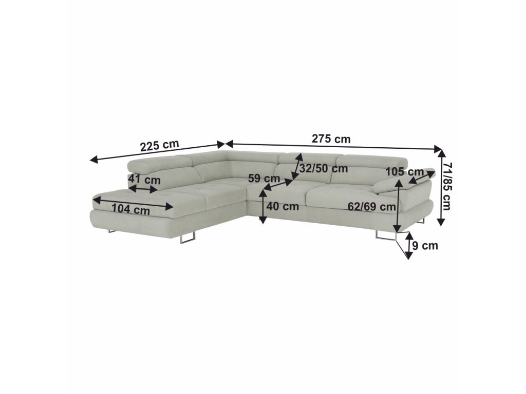 Materiál: látka Soro 83 Oděruodolnost textilie podle testu Martindale: 90 000- 100 000 oděrů Barva: světle šedá Rozměry (ŠxHxV): 275x225x71/85 cm. Výška sedu: 40 cm Hloubka sedu: 59 cm Výška spodního prostoru od podlahy: 9 cm Výška zádové opěrky: 32/50 cm Hloubka sklopené zádové opěrky: 41 cm Opěrka na ruku (HxV): 105x62/69 cm Šířka otomanu: 104 cm Nosnost: 90 kg Rohová Dekorativní prošití Zajímavá opěrka 3 polohovací opěrky hlavy 5 stupňové polohování opěrek Celočalouněná Pružinová výplň Nožičky kovové s povrchovou úpravou chrom Levé provedení Dodáváno bez dekorativních polštářků Dodáváno v demontu Nabízíme vám možnost objednat si sedačku v 7 barevných provedeních látky Soro dle vzorníku. Váš výběr napište přímo do poznámky v objednávce. Cena sedačky na individuální objednávku je verze s rozkladem a úložným prostorem BUTON R 40.250 Kč a pevná verze bez úložného prostoru BUTON P 37.090 Kč. Při individuální objednávce je třeba zaplatit 20% zálohu z dané částky. Po uhrazení zálohy bude Váš požadavek zadán do výroby. Doba dodání 6-8 týdnů.Balení (počet kusů : 3)