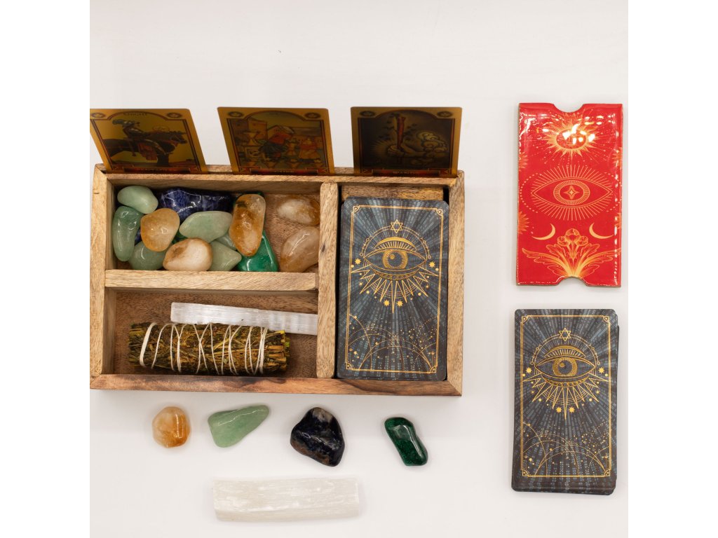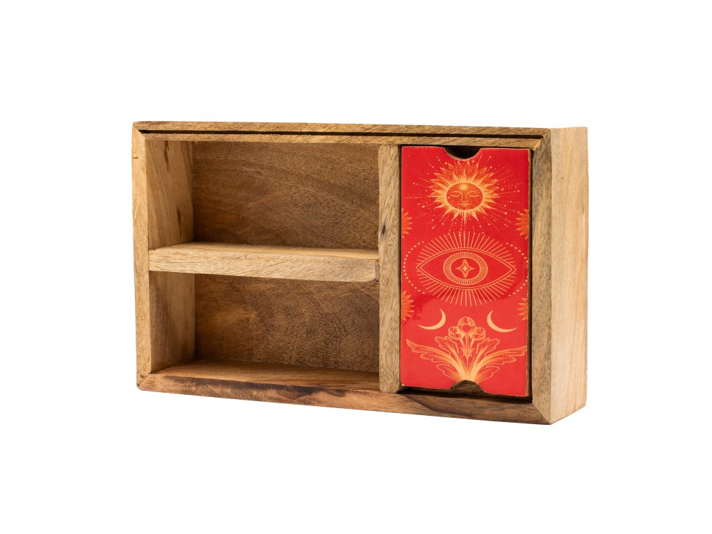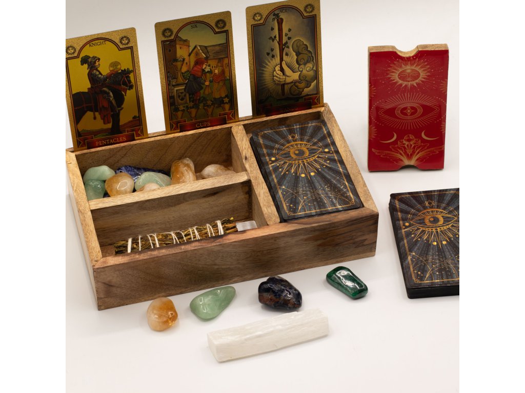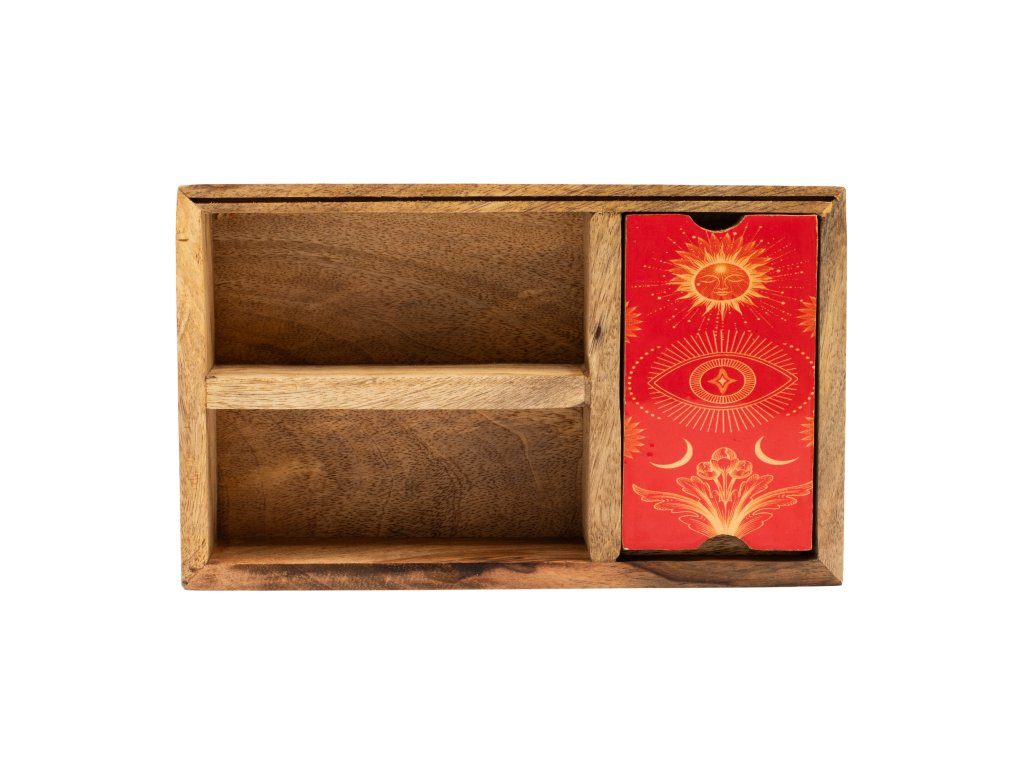 Tato tarotová krabička z mangového dřeva, navržená pro rozsáhlejší výklady, nabízí tři vnitřní části, které podporují vícevrstvý přístup k ukládání a používání karet. Dělené uspořádání umožňuje úhledně uspořádat balíčky, rozložení nebo referenční karty, zatímco integrovaný přední držák karet poskytuje jasné ústřední místo pro vybranou kartu během výkladů nebo vystavení v obchodě. Přírodní dřevěná povrchová úprava zachovává vzhled uzemněný a všestranný, takže se snadno hodí do duchovního, vědomého bydlení a maloobchodního prostředí zaměřeného na dárky. Funkční a výrazný kus, který podporuje jak rituální praktikování, tak vizuální prezentaci.Doplňkové parametry