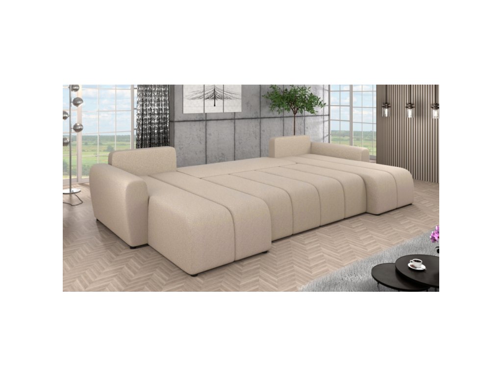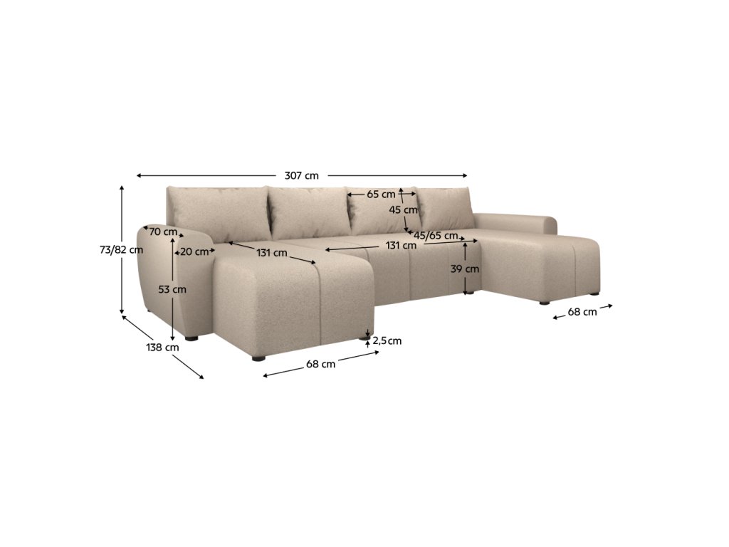 Materiál: látka Soro 21 Oděruodolnost textilie podle testu Martindale: 90 000 oděrů Barva: béžová Rozměry (ŠxHxV): 307x138/138x73/82 cm Rozkládací Plocha na spaní (ŠxD): 108x265 cm Výška sedu: 39 cm Hloubka sedu: 45/65 cm Šířka sedáku: 131 cm Na nožičkách Materiál nožiček: plast Barva nožiček: černá Výška spodního prostoru od podlahy: 2,5 cm Výplň: PUR pěna T28 Univerzální provedení Tvar U Rohová S úložným prostorem Dodáváno s polštáři Rozměry opěrkového polštáře (ŠxV): 65x45 cm Dekorativně prošívaná Dodáváno v demontuBalení (počet kusů : 3)