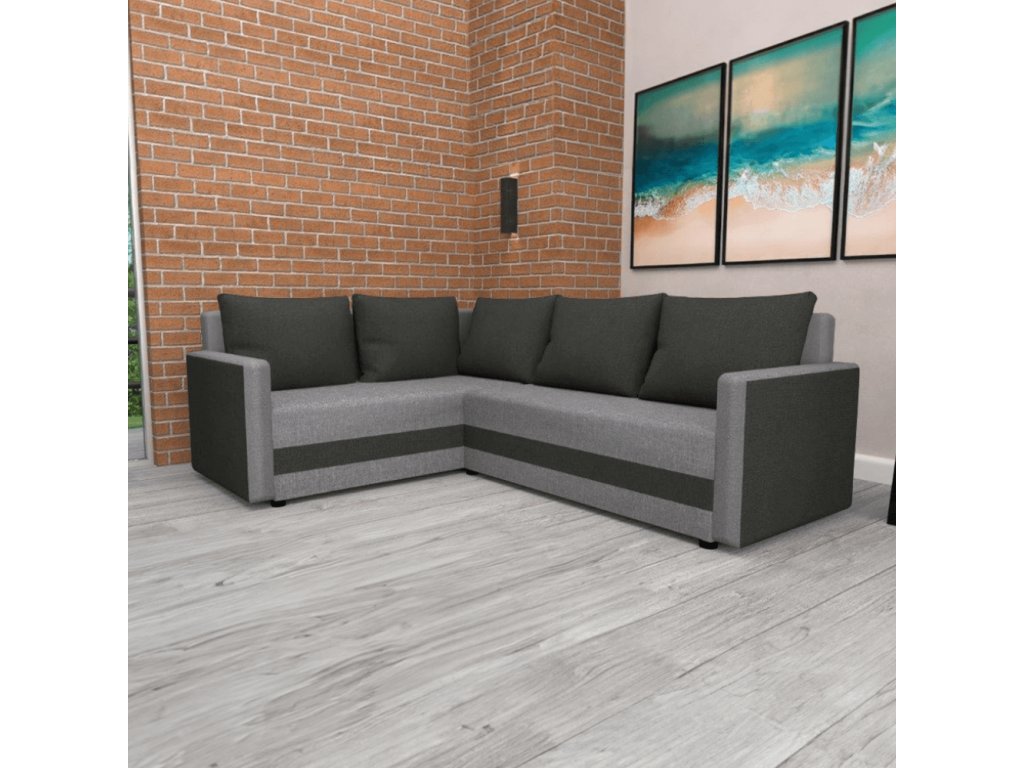 Materiál čalounění: látka Savana 14/21 Oděruodolnost textilie podle testu Martindale: 80 000 oděrů Barva čalounění: černá/šedá Rozměry (ŠxHxV): 214x144/71x73 cm Plocha na spaní (ŠxD): 115x197 cm Rozměry opěrky na ruku (ŠxH): 10x75 cm Výška sedu: 39 cm Hloubka sedu: 45/65 cm Na plastových nožičkách Barva nožiček: černá Výška spodního prostoru od podlahy: 2,5 cm Výplň: pur pěna Rozkládací Rohová Univerzální (L/P) S úložným prostorem Dodávána s pěti polštáři Rozměr polštářů (ŠxH): 64x46 cm Dodáváno v demontuBalení (počet kusů : 2)