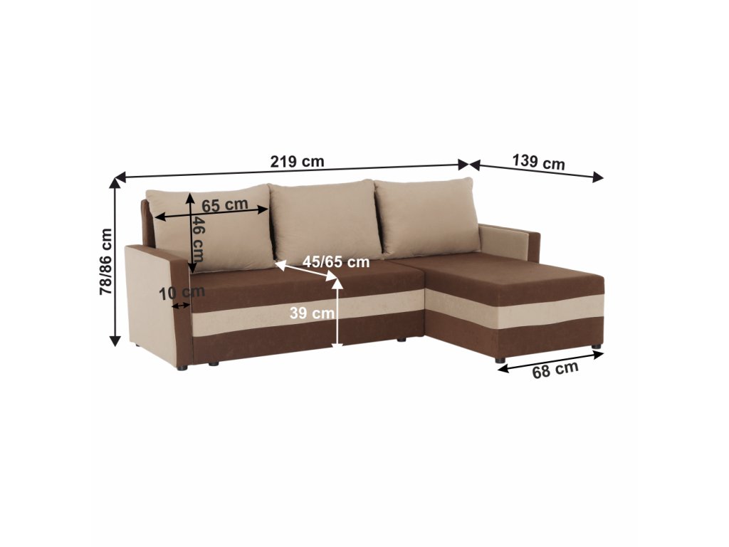 Materiál: látka Alova Oděruodolnost textilie podle testu Martindale: 85 000 oděrek Provedení: 67 hnědá / 07 béžová Rozměry (ŠxHxV): 219x139x78 / 86 cm Plocha na spaní (ŠxD): 119x199 cm Výška sedu: 39 cm Hloubka sedu: 45/65 cm Výška spodního prostoru od podlahy: 2,5 cm Rozměr polštáře (ŠxV): 65x46 cm Šířka otomanu: 68 cm Opěrka na ruku (ŠxV): 10x54 cm Nosnost na osobu: 90 kg Univerzální (L / P) rohová rozkládací S úložným prostorem S polštáři molitanová výplň Dodávané v demontu.Balení (počet kusů : 2)