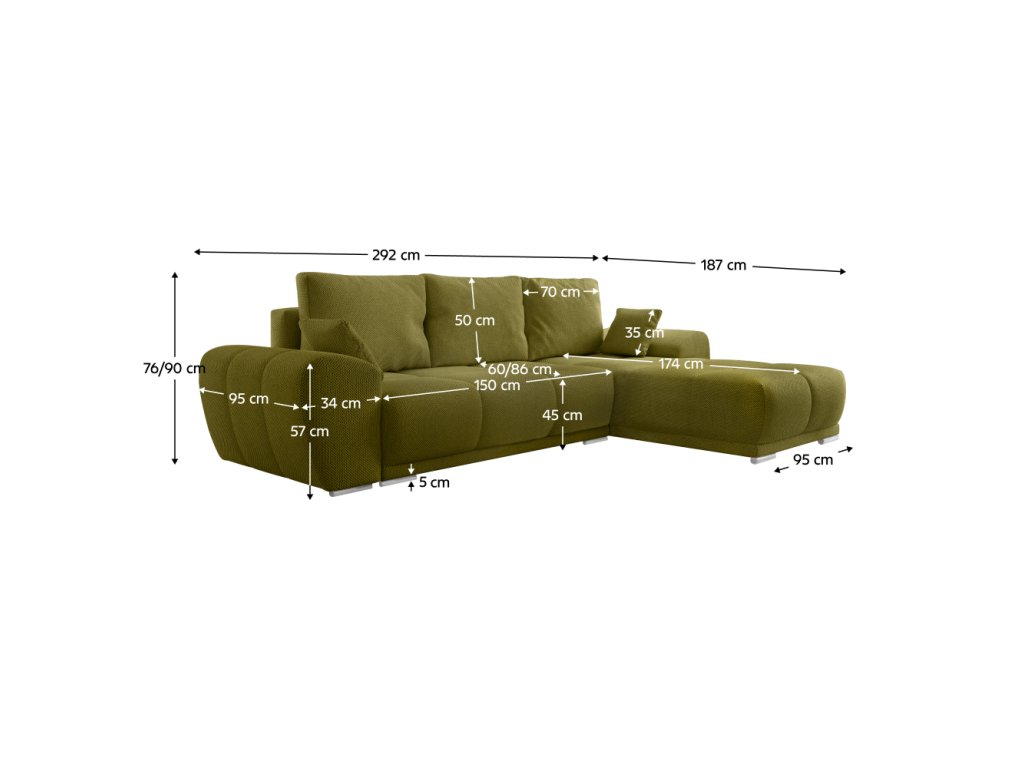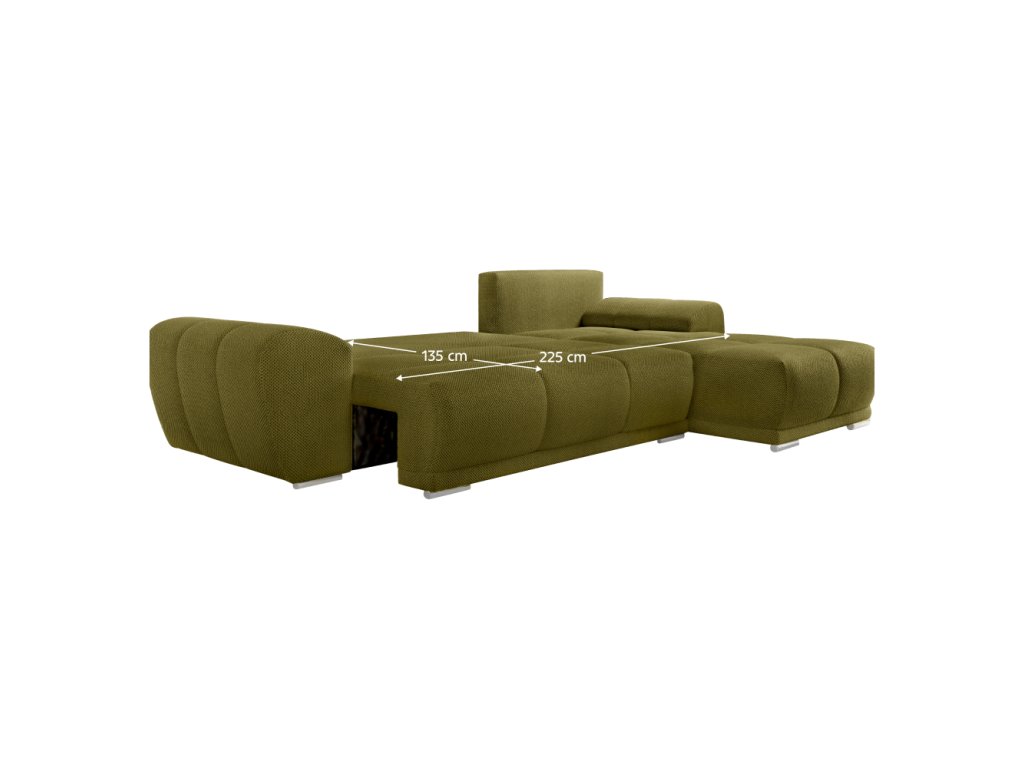 Materiál: látka Curio 35 Oděruodolnost textilie podle testu Martindale: 60 000 oděrů Barva: olivová Rozměry (ŠxHxV): 292x187x76/90 cm Plocha na spaní (ŠxD): 135x225 cm Výška sedu: 44 cm Hloubka sedu: 60/86 cm Rozměry otomanu (ŠxH): 95x174 cm Rozměry opěrky na ruku (ŠxHxV): 34x95x57 cm Šířka sedáku: 150 cm Univerzální Celočalouněná Rozkládací Rohová S úložným prostorem Na nožičkách Materiál nožiček: plast Barva nožiček: stříbrná Výška spodního prostoru od podlahy: 5 cm Výplň: pružina falista/pur pěna S polštáři Rozměry polštářů (ŠxV): 70x50 cm Rozměry dekorativních polštářů (ŠxV): 35x35 cm Praktická Moderní Dodáváno v demontu Nabízíme vám možnost vybrat si ze 6 barevných provedení látky Curio za cenu 27 490 Kč. Po uhrazení zálohy bude Váš požadavek zadán do výroby. Dodací lhůta 6-8 týdnů.Balení (počet kusů : 4)