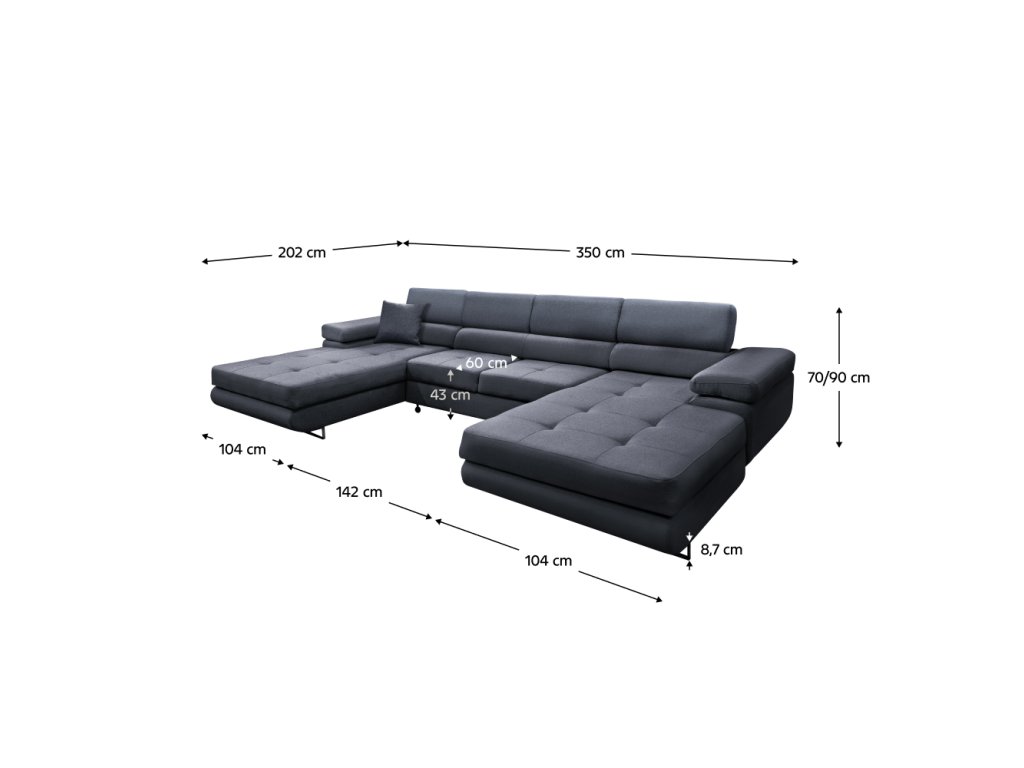 Materiál: látka Monolith 97 Oděruodolnost textilie podle testu Martindale: 100 000 oděrů Barva: šedá Rozměry (ŠxHxV): 350x202/202x70/90 cm Výška sedu: 43 cm Hloubka sedu: 60 cm Plocha na spaní (ŠxD): 125x285 cm Výška spodního prostoru od podlahy: 8,7 cm Nosnost na osobu: 90 kg Šířka otomanu: 104 cm Šířka sedáku: 142 cm Výplň: pur pěna+HR pěna Celočalouněná Rozkládací Univerzální Rohová S úložným prostorem Dekorativní šití sedáku 4 polohovací opěrky hlavy 6 stupňové polohování opěrek Moderní designové nožičky Materiál nožiček: kov Barva nožiček: stříbrná S úložným prostorem Dodáváno s polštářkem Dodáváno v demontu Možnost objednání v 6 barevných provedeních látky Monolith v ceně 45.590 Kč. Při individuální objednávce je třeba zaplatit 20% zálohu z dané částky. Po uhrazení zálohy bude Váš požadavek zadán do výroby. Doba dodání 6-8 týdnů.Balení (počet kusů : 3)