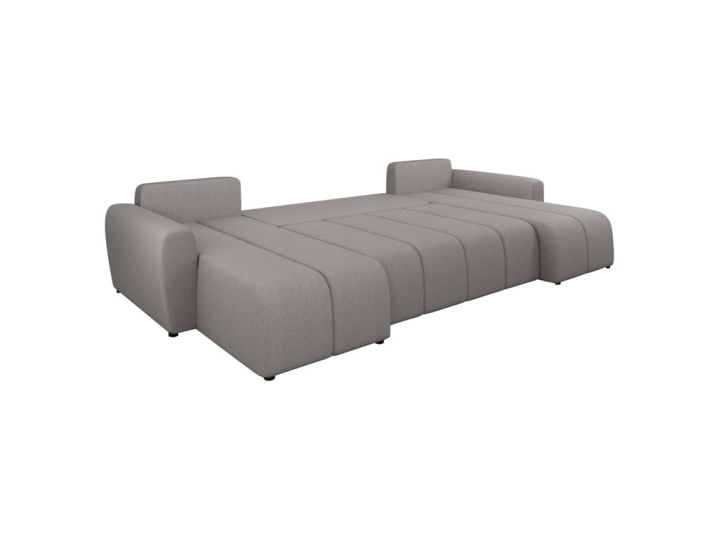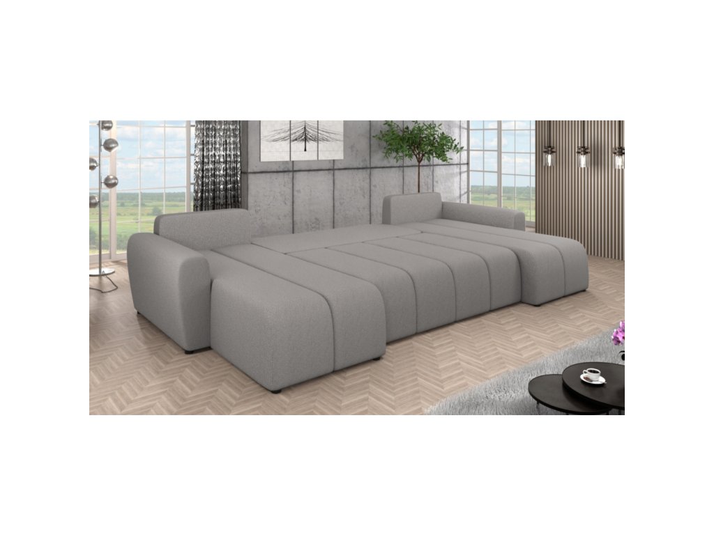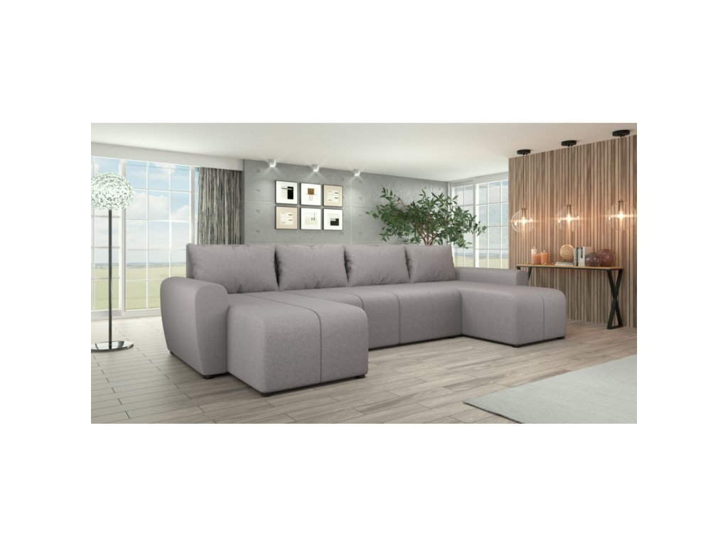 Materiál: látka Soro 90 Oděruodolnost textilie podle testu Martindale: 90 000 oděrů Barva: šedá Rozměry (ŠxHxV): 307x138/138x73/82 cm Rozkládací Plocha na spaní (ŠxD): 108x265 cm Výška sedu: 39 cm Hloubka sedu: 45/65 cm Šířka sedáku: 131 cm Na nožičkách Materiál nožiček: plast Barva nožiček: černá Výška spodního prostoru od podlahy: 2,5 cm Výplň: PUR pěna T28 Univerzální provedení Tvar U Rohová S úložným prostorem Dodáváno s polštáři Rozměry opěrkového polštáře (ŠxV): 65x45 cm Dekorativně prošívaná Dodáváno v demontuBalení (počet kusů : 3)