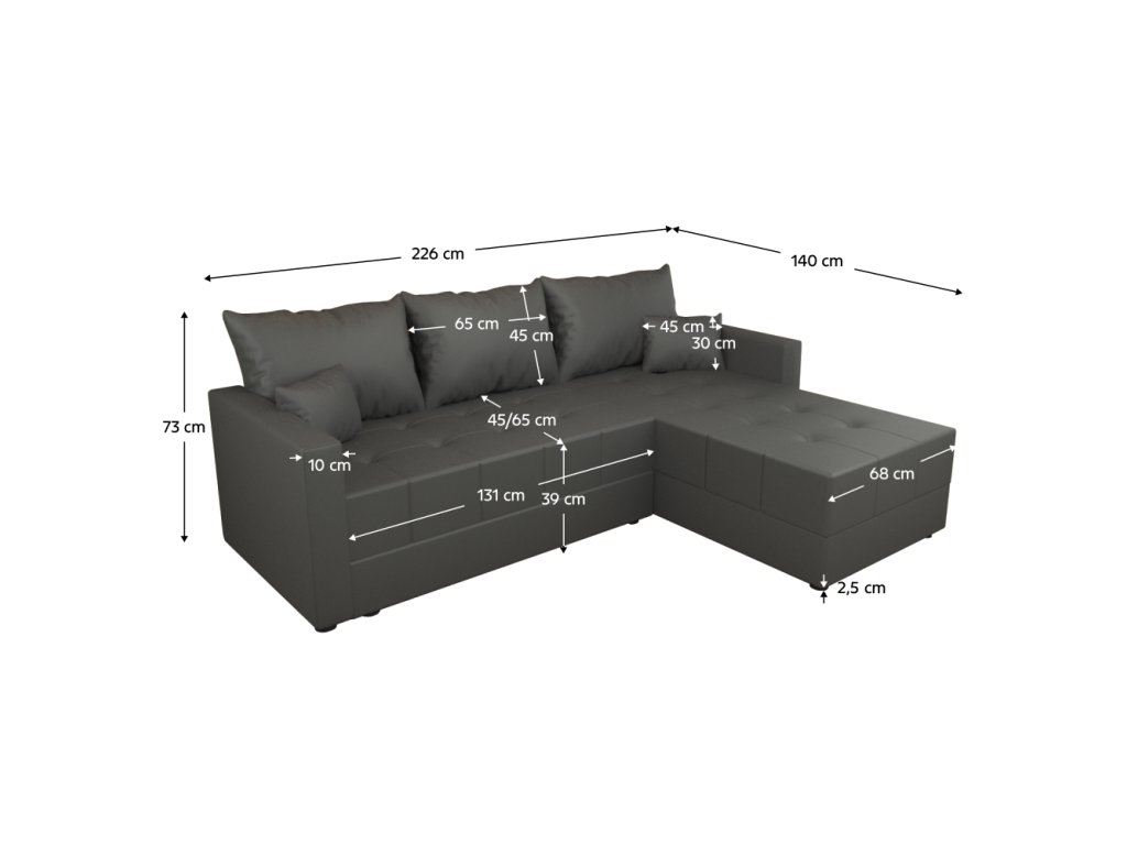 Materiál: látka Riviera 97 Oděruodolnost textilie podle testu Martindale: 90 000 oděrů Barva: šedá Rozměry (ŠxHxV): 226x140x73 cm Rozkládací Plocha na spaní (ŠxD): 119x199 cm Výška sedu: 39 cm Hloubka sedu: 45/65 cm Šířka sedáku: 131 cm Šířka otomanu: 68 cm Na nožičkách Materiál nožiček: plast Barva nožiček: černá Výška spodního prostoru od podlahy: 2,5 cm Výplň: PUR pěna T28 Univerzální provedení Rohová S úložným prostorem Dodáváno s polštáři Rozměry dekorativních polštářů (ŠxV): 45x30cm Rozměry opěrkového polštáře (ŠxV): 65x45 cm Dodáváno v demontuBalení (počet kusů : 2)