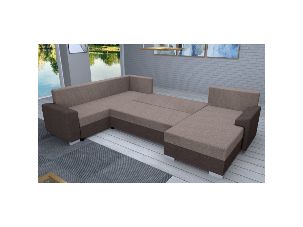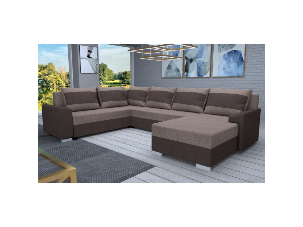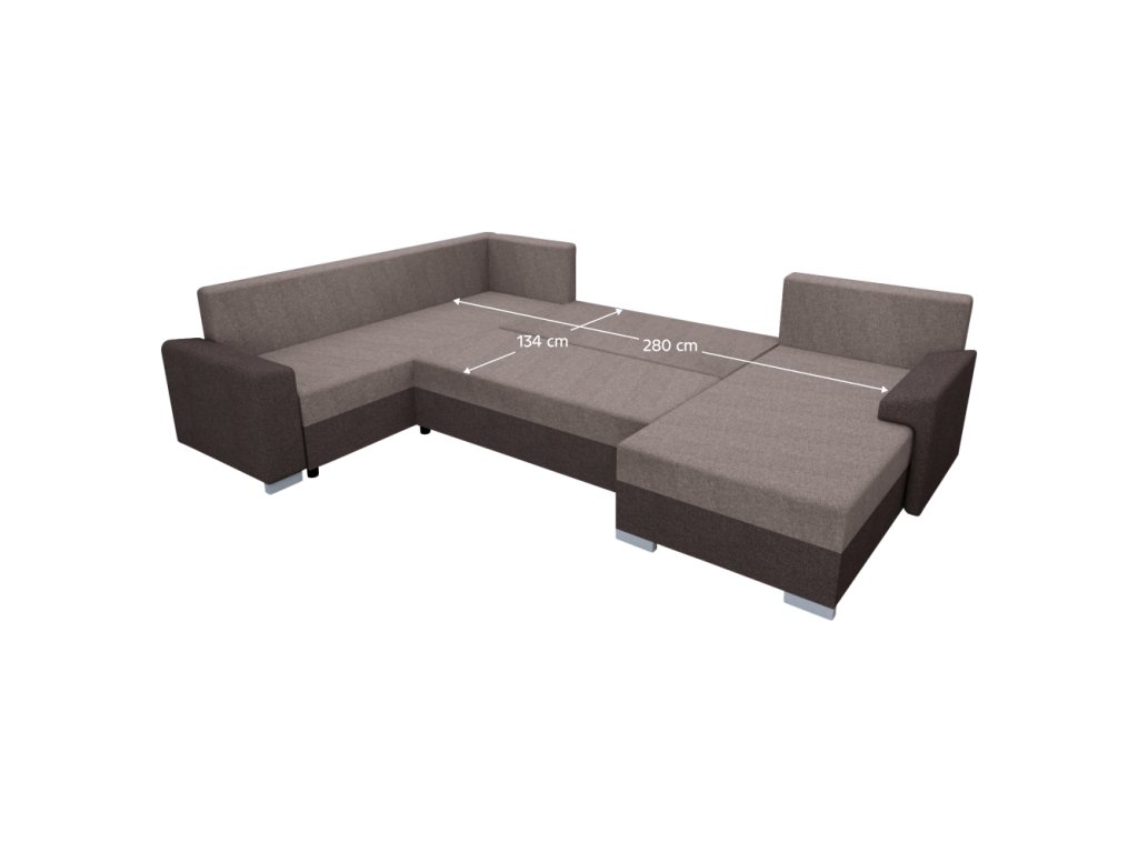 Materiál: látka Twist 22/03 Oděruodolnost textilie podle testu Martindale: 45 000 oděrů Barva: tmavě hnědá/hnědošedá Taupe Rozměry (ŠxHxV): 294x153/205x75/85 cm Plocha na spaní (ŠxD): 134x280 cm Výška sedu: 40 cm Hloubka sedu: 50/70 cm Šířka otomanu: 81 cm Šířka volného prostoru mezi otomany: 136 cm Na nožičkách Materiál nožiček: plast Barva nožiček: stříbrná Výška spodního prostoru od podlahy: 4,5 cm Celočalouněná Univerzální (L/P) Rohová Tvar U Rozkládací S úložným prostorem Výplň: pur pěna Dodávána s polštáři Rozměr polštáře (ŠxV): 44x69 cm Dodáváno v demontuBalení (počet kusů : 3)