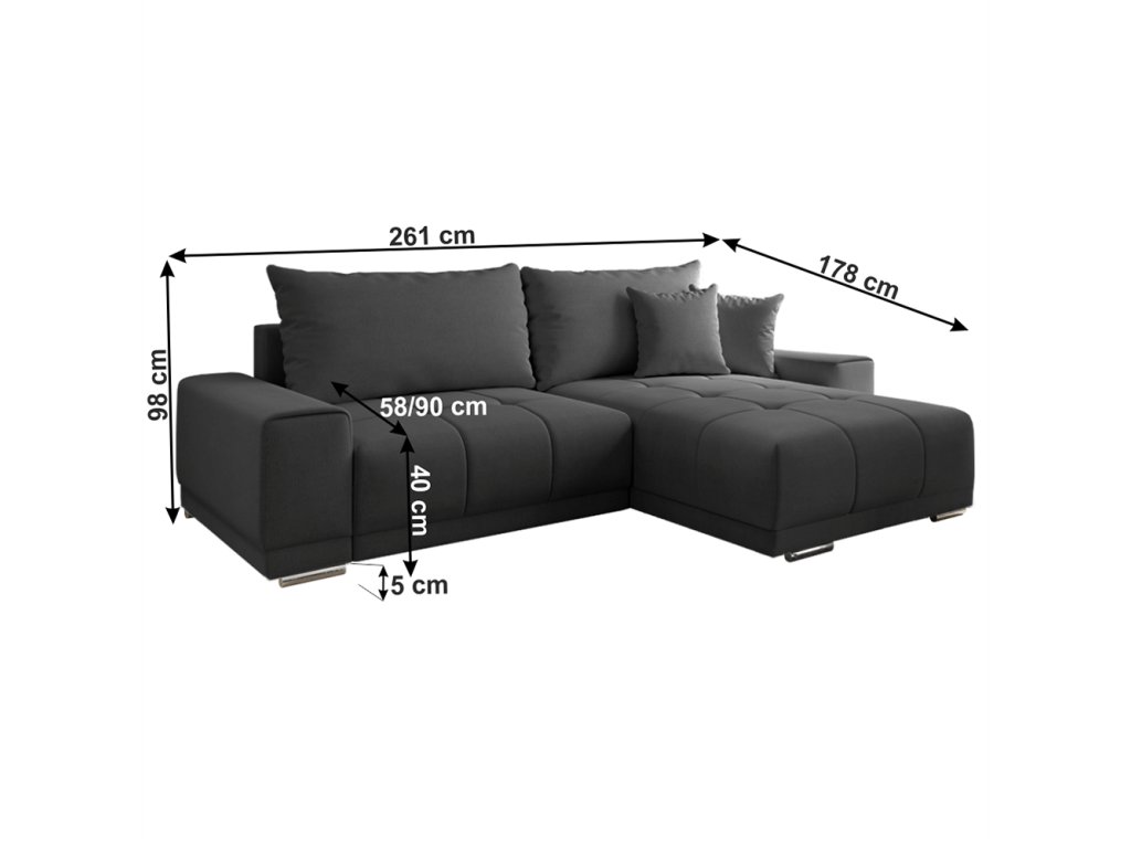 Materiál: látka SORO Oděruodolnost textilie podle testu Martindale: 90 000- 100 000 oděrů Provedení: 97 tmavě šedá Rozměry (ŠxHxV): 261x178x98 cm Plocha na spaní (ŠxD): 148x203 cm Výška sedu: 40 cm Hloubka sedu: 58/90 cm Výška spodního prostoru od podlahy: 5 cm celočalouněná Univerzální (L / P) rohová rozkládací S úložným prostorem dekorativní prošívaná S polštáři Pružina faliste / pur pěna Dodávané v demontu. Možnost objednat v 6 barevných provedeních látky Alfa v ceně 22.790 Kč. Při individuální objednávce je třeba zaplatit 20% zálohu z dané částky. Po uhrazení zálohy bude Váš požadavek zadána do výroby. Doba dodání 6-8 týdnů.Balení (počet kusů : 3)