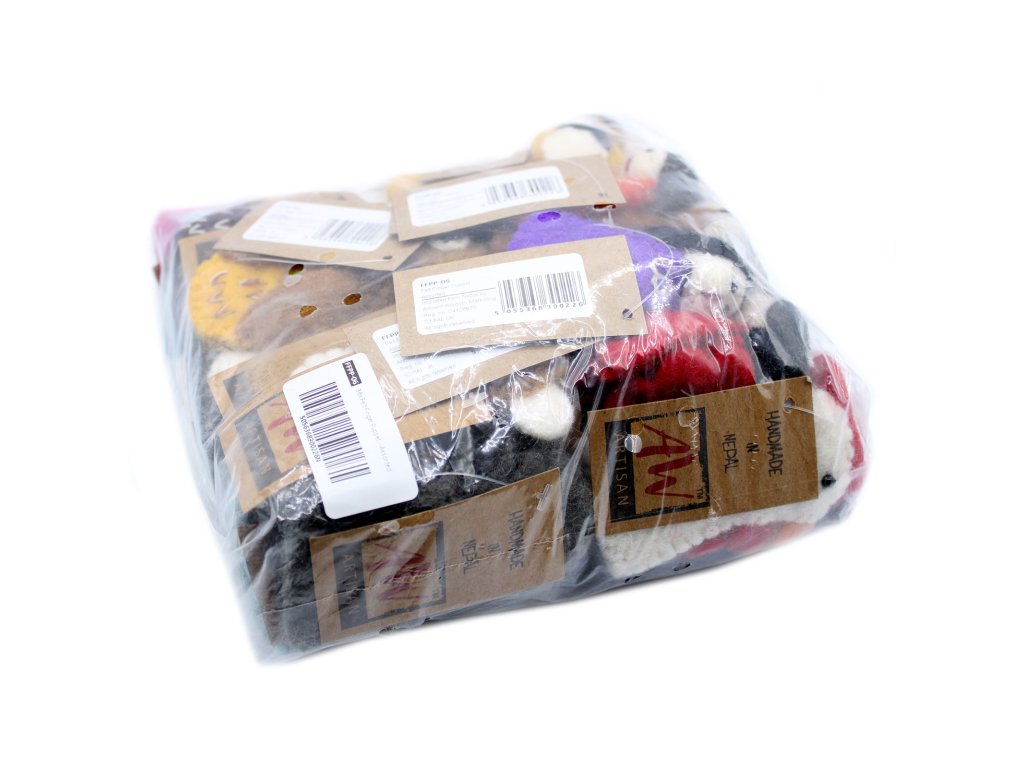 Tyto Velkoobchodní Váčky s Maňásky si získají srdce Vašich zákazníků a jejich dětí. Tyto zábavní maňásci pro děti jsou uvnitř malých kapes v každém váčku. Maňásci sovy, koček, slonů, myší, medvědů a ovcí jsou ideální velikosti pro děti a většinu dospělých. Maňásci jsou skvělou pomůckou pro vyprávění příběhů a vyjádření emocí.Váčky a maňásci jsou ručně vyráběné z plsti v Nepálu. Jsou uzavíratelné zipem. Váčky jsou v rozměru 16 x 11.5cm.Doplňkové parametry