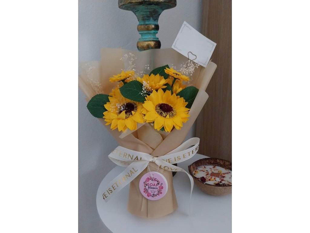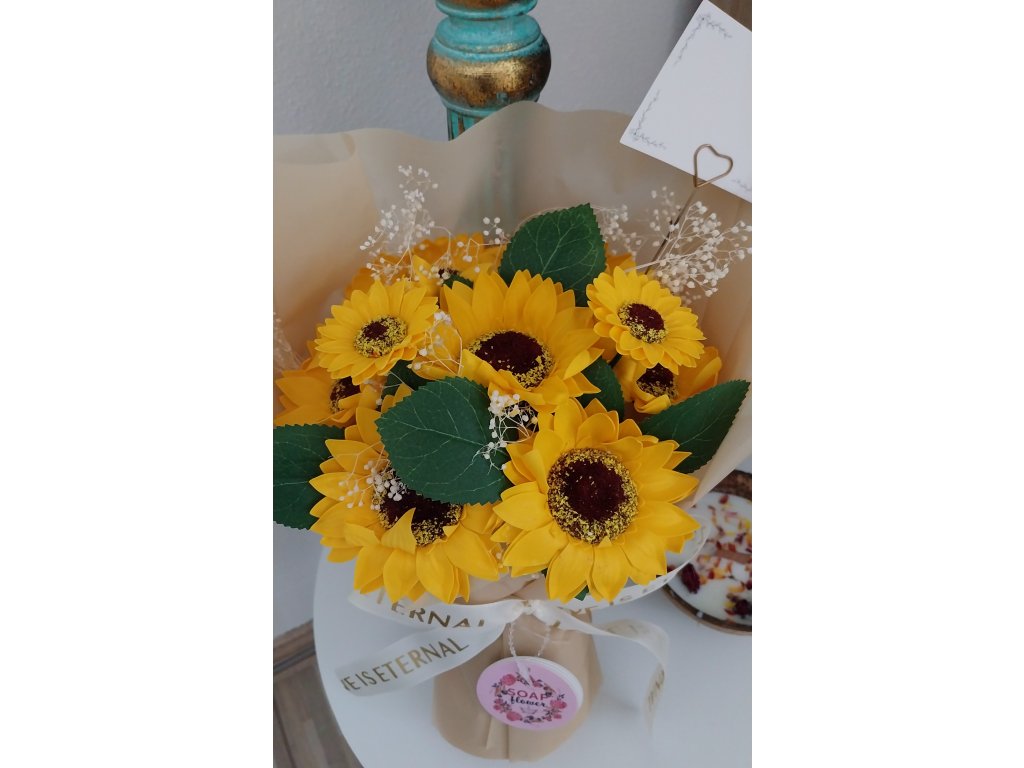 Tato zářivá a teplá kytice z mýdlových květin zachycuje radostné kouzlo pravých slunečnic. Každý květ je vyroben z vysoce kvalitních mýdlových okvětních lístků, které vypadají jako živé a zároveň krásně vydrží. Zabalená v jemných tónech a zakončená stuhou „Láska je věčná“ přináší radost a pozitivitu do každé dárkové prezentace. Doplněná malou kartičkou s osobním vzkazem je tato kytice skvělou volbou k narozeninám, dárkům s poděkováním nebo povzbudivému vystavení v obchodě.Doplňkové parametry